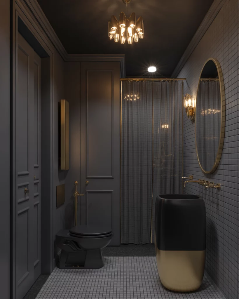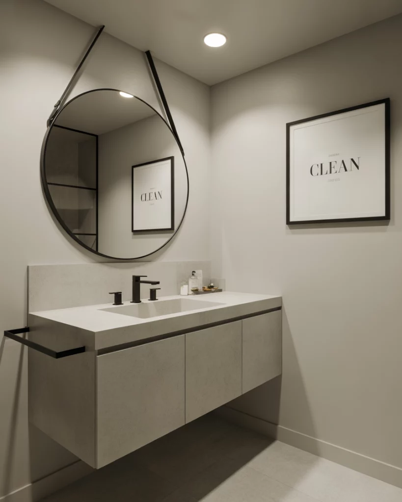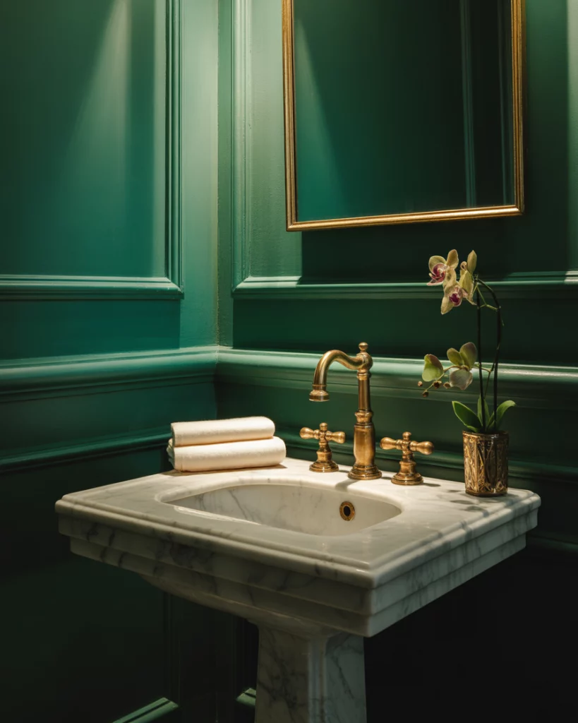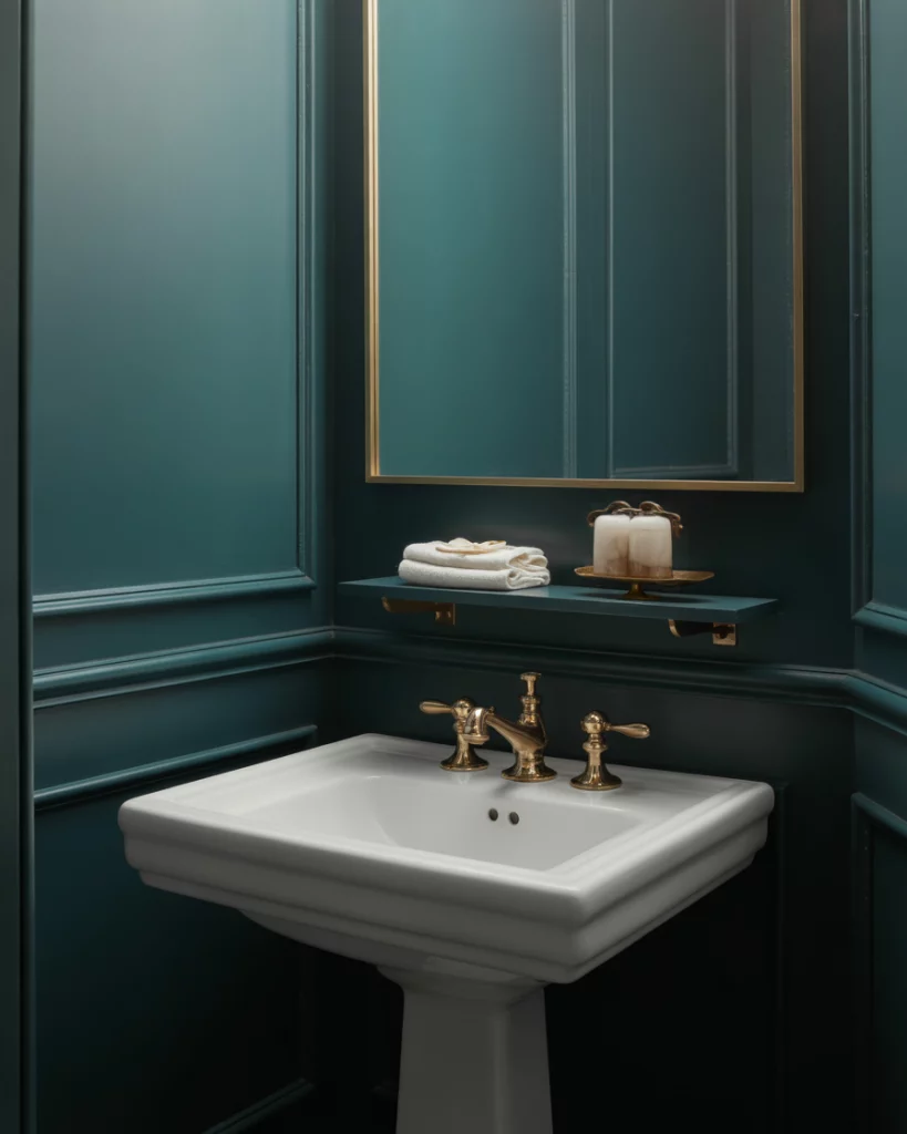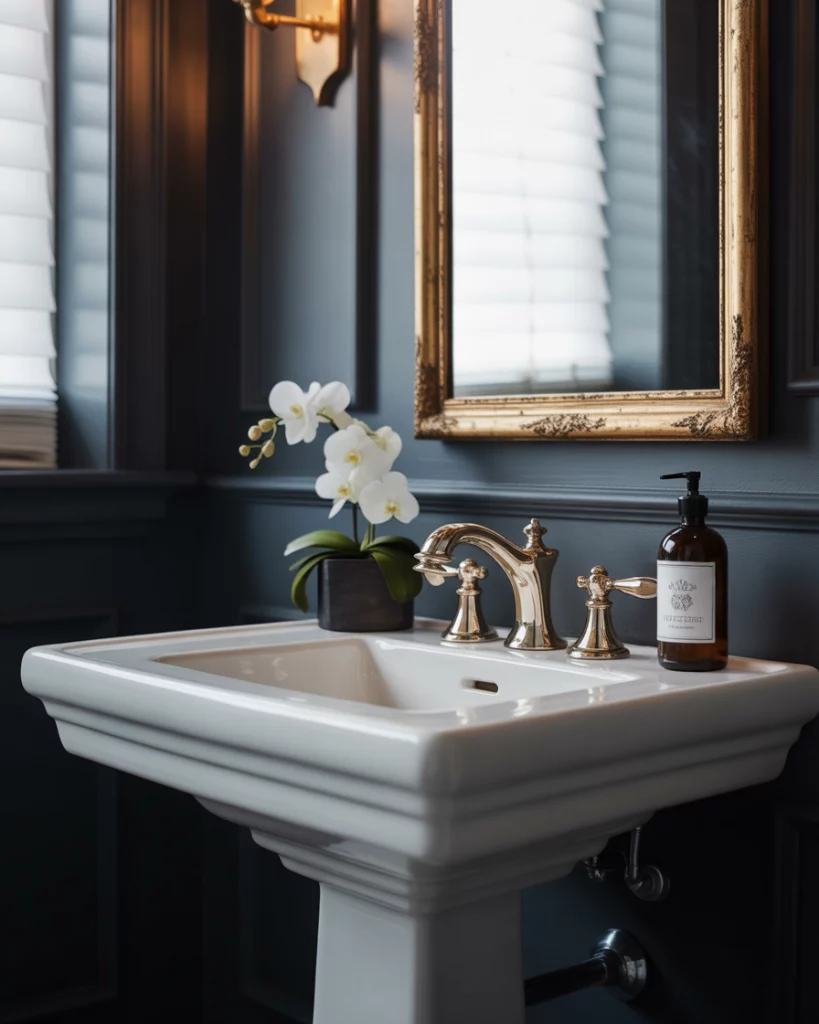 Going full dark in your powder room may seem daring, but it often pays off. Visualize walls in a matt black, smoked glass mirrors, and minimal lighting. The style can be used in combination with un-lacquered brass or brushed gold. It’s a nod to modern luxe and works best in half baths where you want guests to stop and stare.