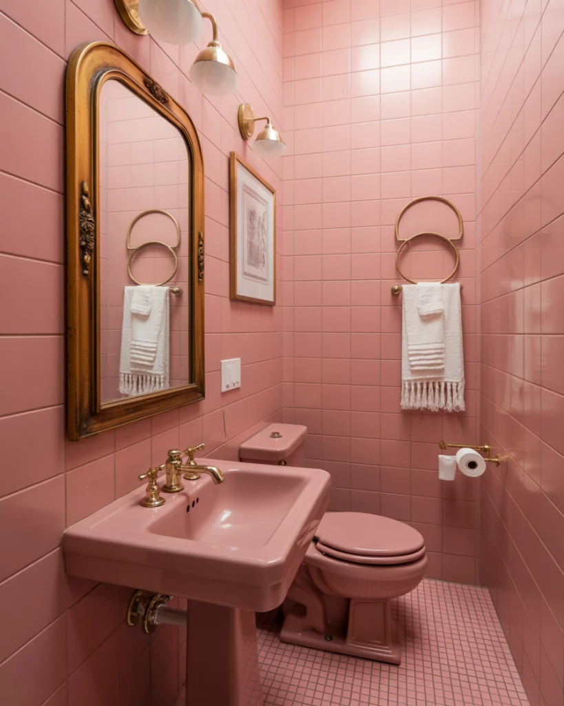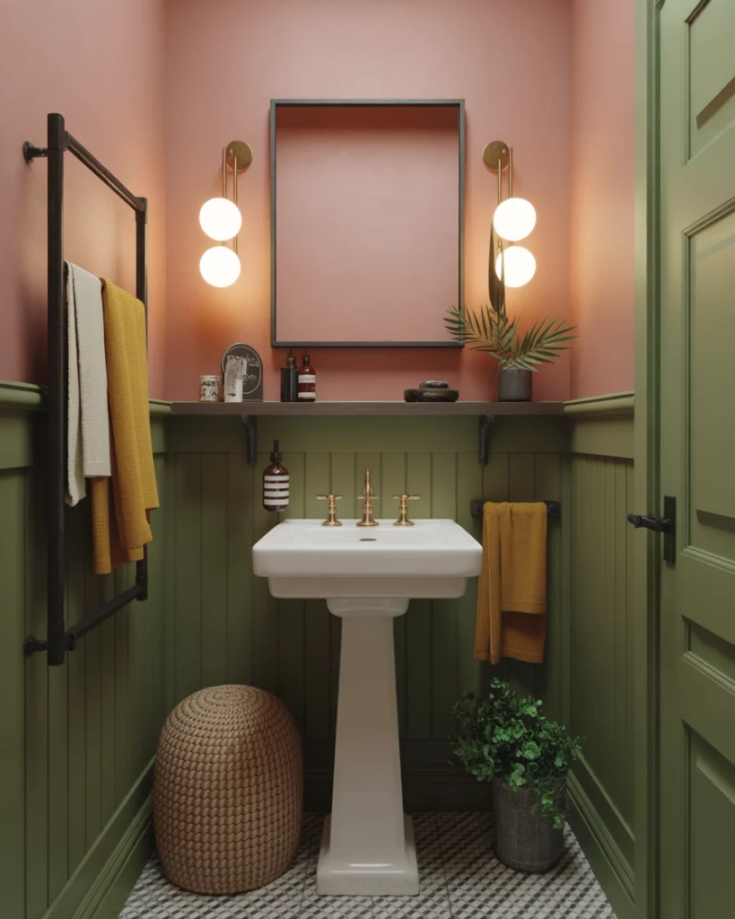 Add a playful, fun twist with pink! Pink paint is warm, charming whether in the shade of blush to coral. Throw it in gold and fixtures, a statement mirror and diffused light to add a touch of glamour. A white or rose-toned pedestal sink completes this soft and stylish idea — ideal for feminine and cozy tiny spaces.