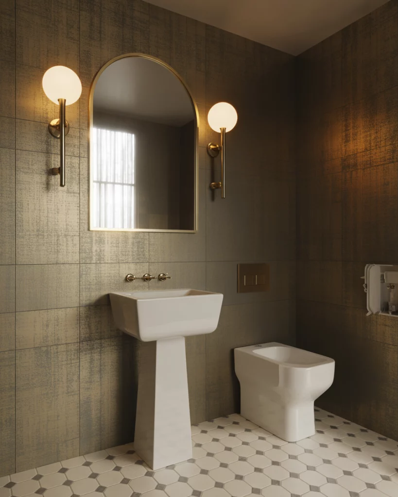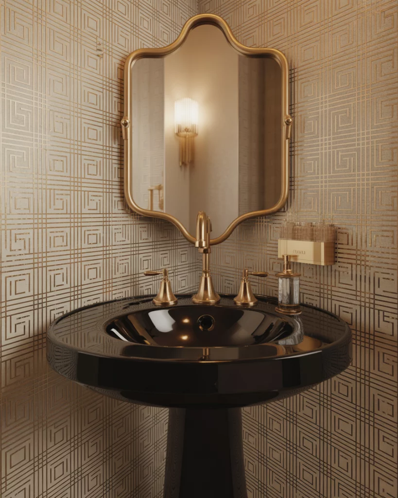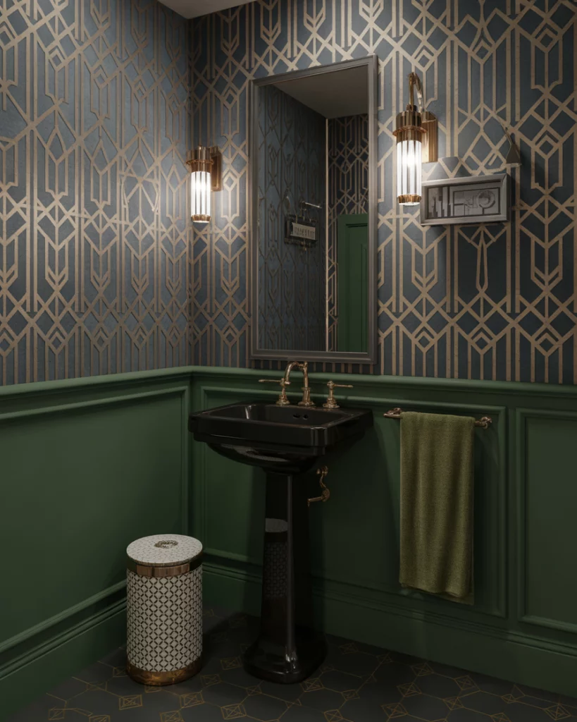 Bring back the glam of the roaring ’20s with half baths designed in true Art Deco fashion. Consider striking geometric wallpaper, slick and black tile, brass accents and an alluring mirror. Add a black or white pedestal sink for contrast. This style is ideal for those who want a luxe yet structured aesthetic and works beautifully in half baths modern interiors that crave a vintage touch.