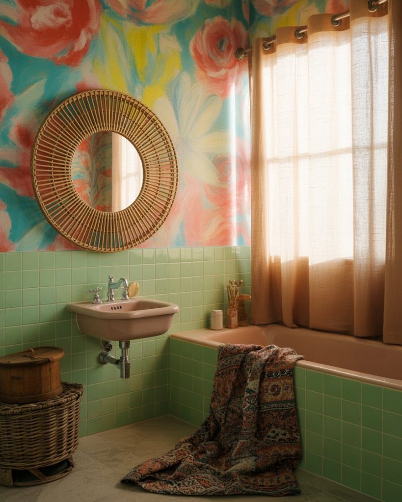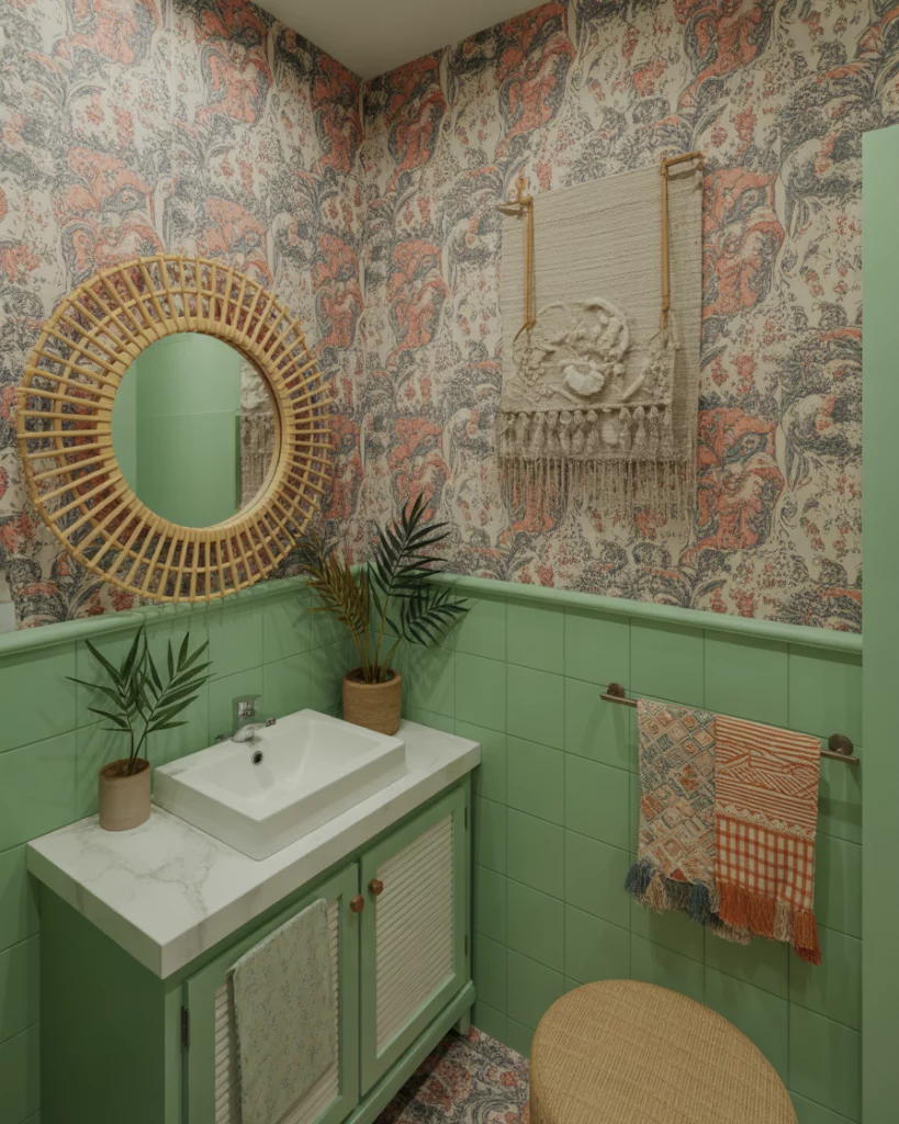 A fun, eclectic powder room filled with texture and personality defines the boho look. Make the walls equipped with colorful wallpaper, rattan mirrors, brass faunces, and textures. Green or ochre walls and patterned rug are the options. This approach brings charm and warmth, making even tiny spaces feel vibrant and soulful.