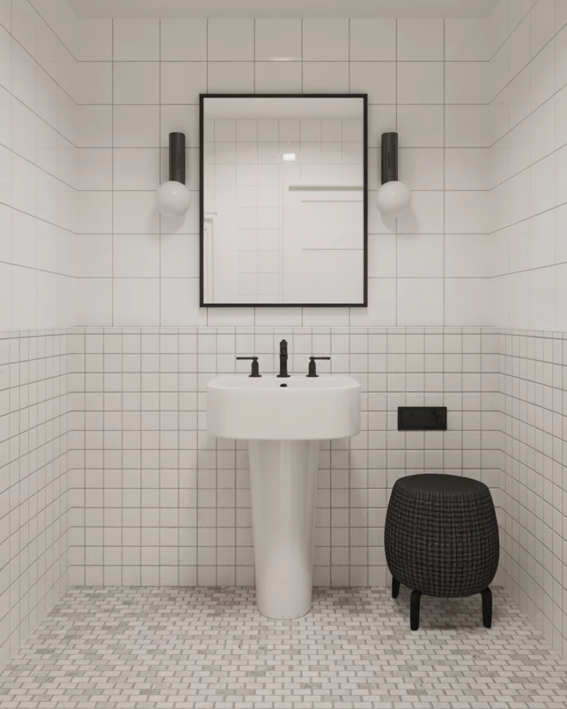 For a bold yet timeless look, go for a black-and-white palette. This traditional pairing is magic in small half bathrooms, and it highlights form and contrast. Checkerboard tile, white pedestal sink, matte black accents. This high-contrast scheme fits perfectly into half baths modern homes and never goes out of style.