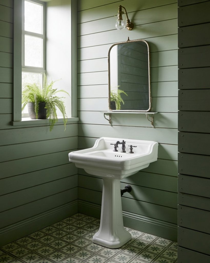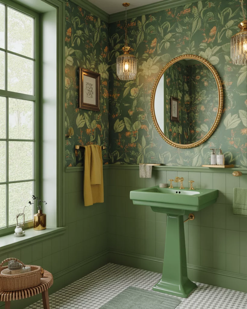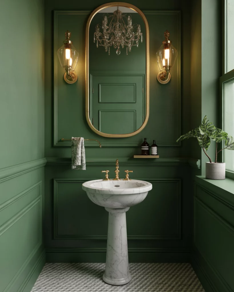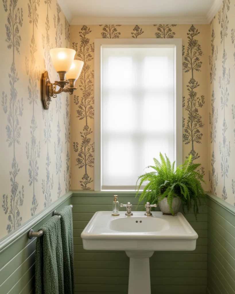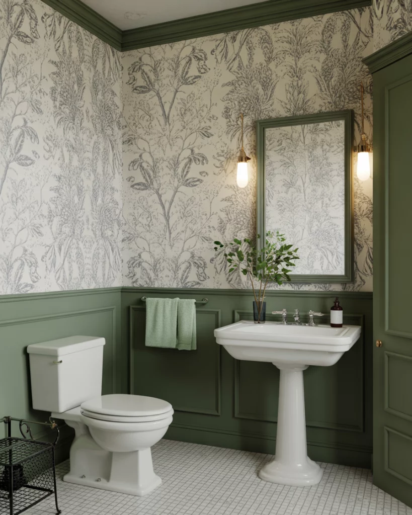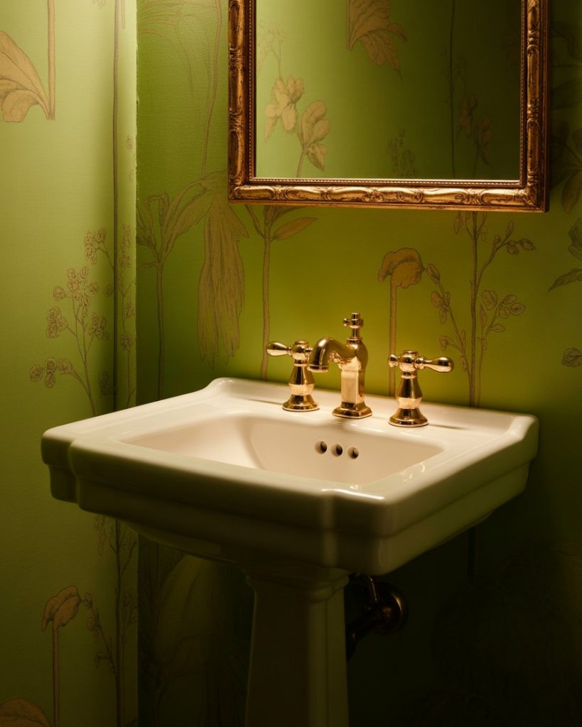 Green has re-emerged as a powerhouse in design. It offers sage to emerald and it brings an organic richness that lends itself well to half baths. Combine green walls with wallpaper botanical prints or accessorize by using gold-trimmed items. This combo nods to both classic and contemporary styles. Designer Shea McGee often recommends green tones for their “ability to ground a room without overwhelming it.”