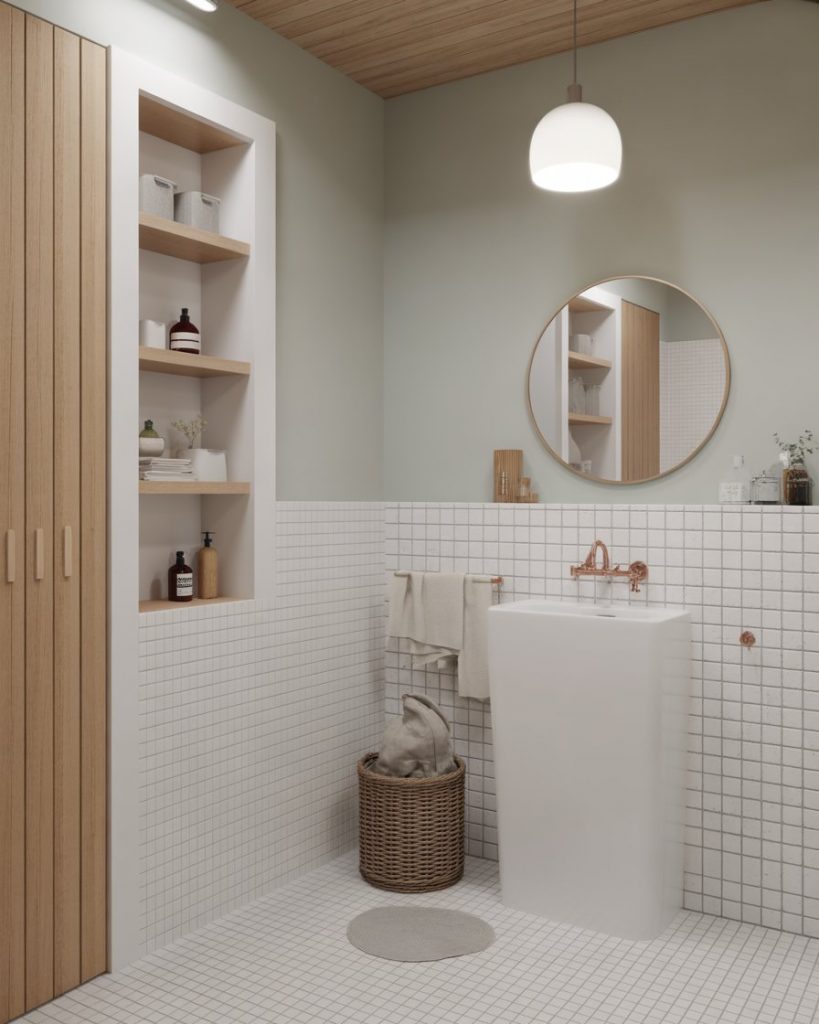 Clean lines, pale wood, and minimalism define this look. Examples of Modern Scandinavian powder rooms are the use of soft gray or white paint, a round simple mirror, and use of matte black hardware. Include a light oak base on your pedestal sink or create some open shelving to add a splash of warmth. The result is a calming, organized space — ideal for half baths in contemporary homes.