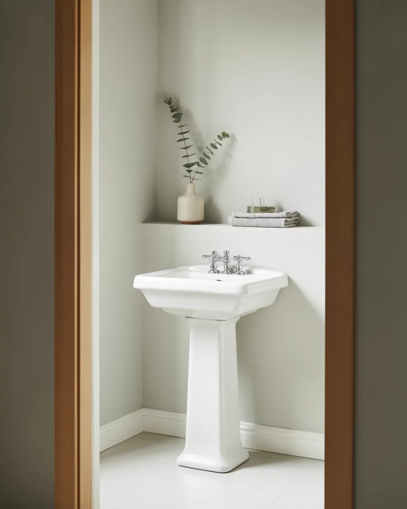 In very tiny powder rooms, a striking pedestal sink can become the focal point. Look for unexpected materials—colored porcelain, marble, or vintage styles. Paint the walls at the opposite tone to make sink shine. Add a round mirror and single sconce for balance. This approach shows that you don’t need much space to make a design statement.
