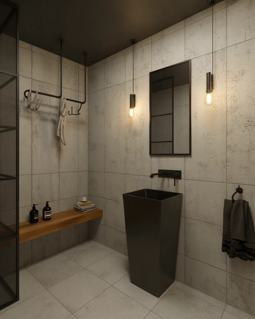 For a sleek, urban vibe, try an industrial-style half bath. Walls or floor tile of concrete, black metal lighting, exposed plumbing establishes the tone. It is put together with a minimalist pedestal sink or basin on a metal frame. Perfect for lofts or homes that lean toward half baths modern with an edge.