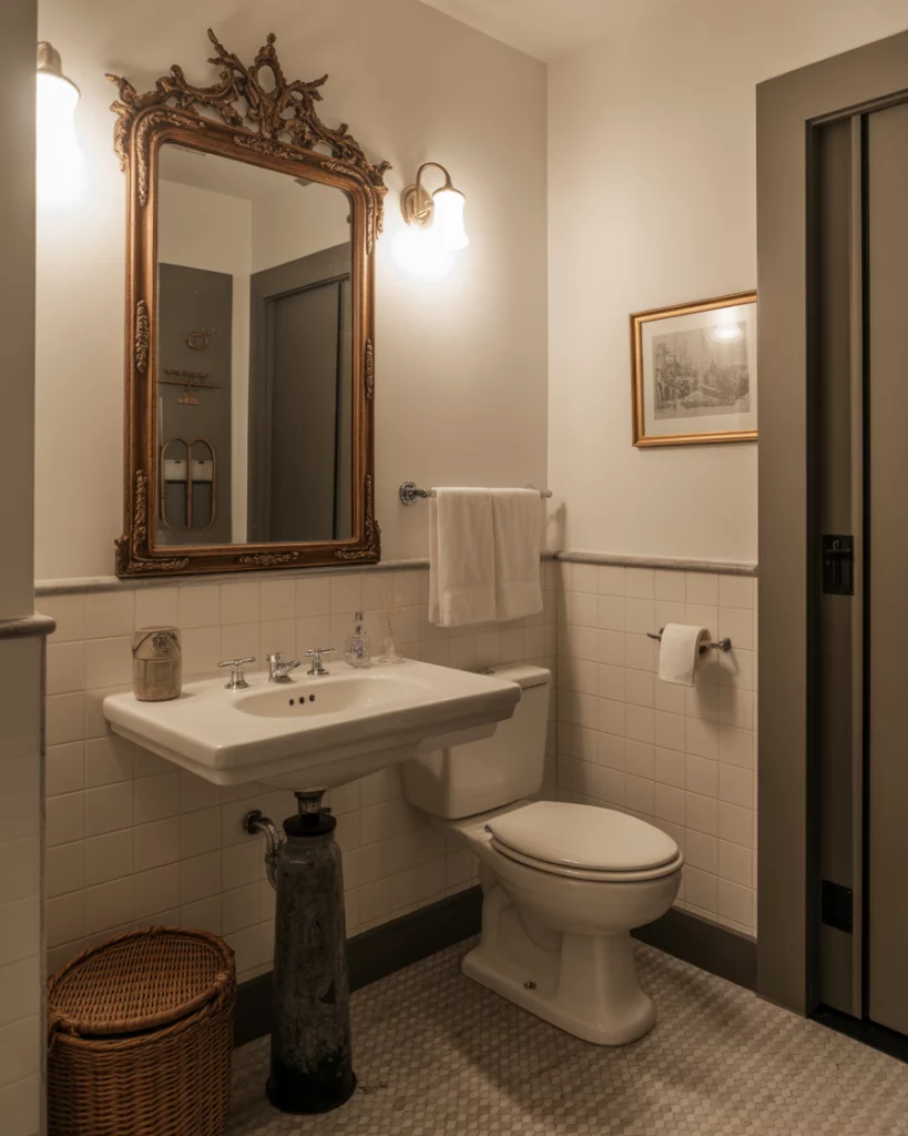 Mixing old and new is a winning strategy in half baths. Have a pedestal sink mounted over an antique dresser, add antique light or mirror and offset with contemporary tile or fixtures. This blend gives character while keeping things fresh — a great option for design lovers who crave classic elements with a twist.