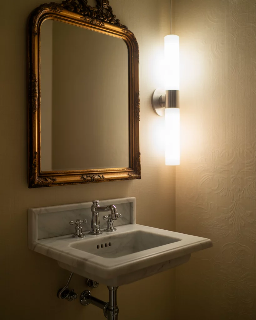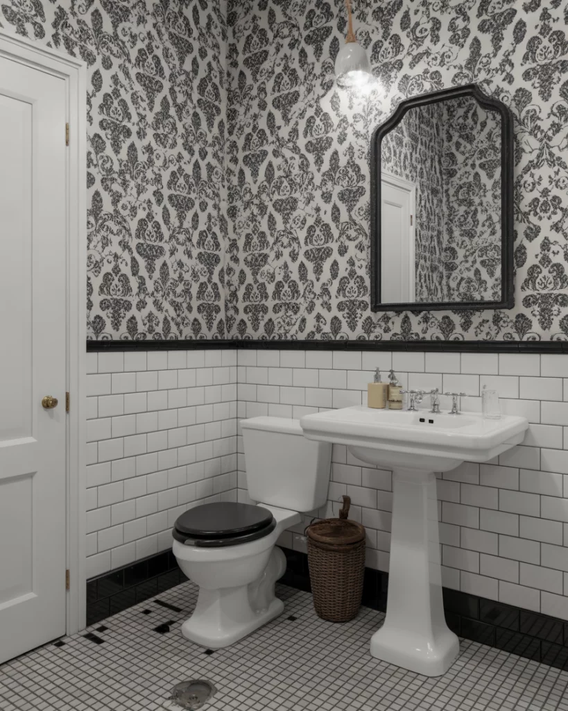 A classic powder bathroom never goes out of style. Select black-and-white tiles, wainscoting, a beautiful pedestal sink with cross-handle faucets made of porcelain. Immediately add a touch of old-world with a wallpaper in a toile or damask pattern to liven the room. According to Traditional Home magazine, “The powder room is a stage for nostalgic design.” This approach suits both vintage homes and new builds aiming for timelessness.