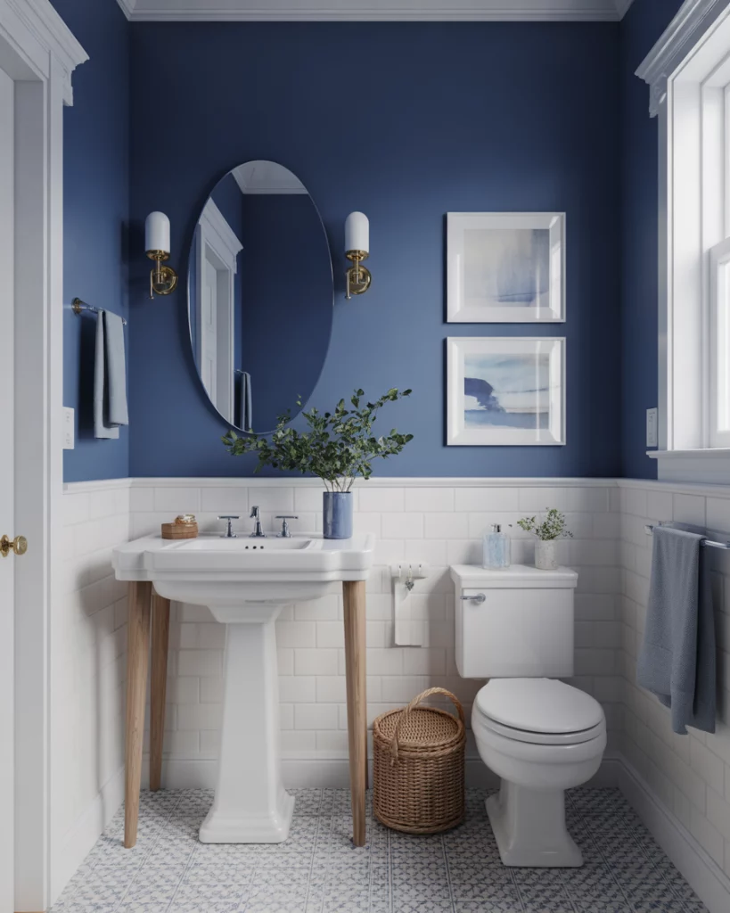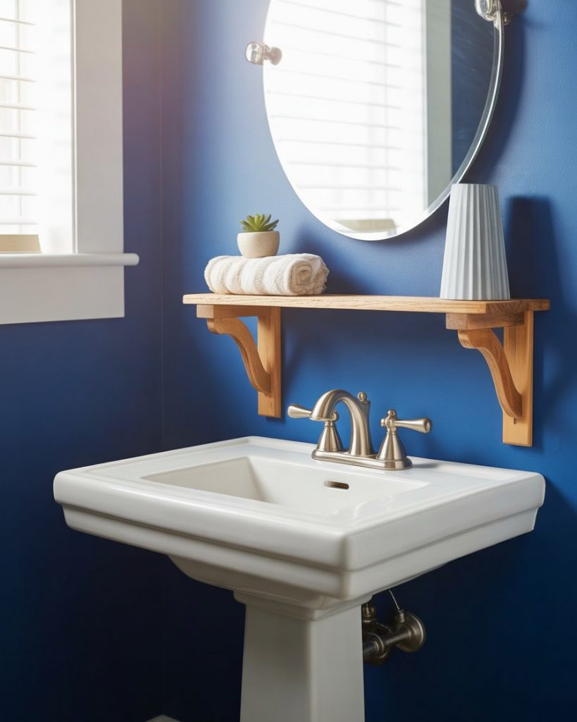 In tiny powder bathrooms, going moody creates a surprising sense of sophistication. Daring navy, charcoal or even black paint will make walls recede to create an illusion about depth. Add some metallical accents or a marble pedestal sink to oppose it and this becomes a jewel box. As designer Emily Henderson notes, “Small spaces handle dark colors beautifully if you balance them with lighting and texture.” This idea works well in half baths modern homes that crave impact without size.