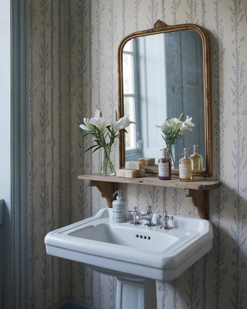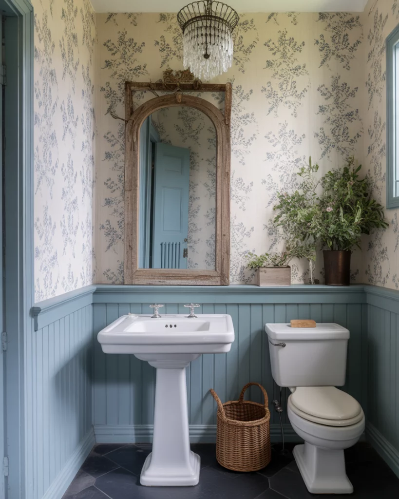Capture the warmth of the French countryside in your half baths with vintage details and rustic elegance. Paint subtle colors such as light blue or cream, use an aged wood mirror and use wrought iron. The setting is made complete with a porcelain pedestal sink and flowered wallpaper which gives it that lived-in romantic look. This idea blends classic and rustic aesthetics beautifully.