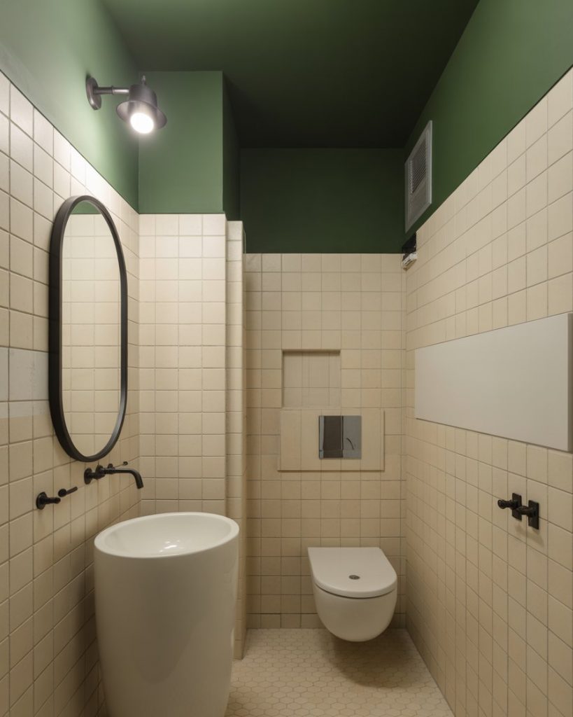 Don’t forget to look up! Some unexpected flair can be achieved by painting or papering the ceiling in especially itsy-mini powder room. Employ bold green, a starburst pattern or even metallic. Have the walls as plain as possible and place a clean pedestal sink so that the ceiling can speak. This works especially well in half baths modern homes that favor creativity over conformity.