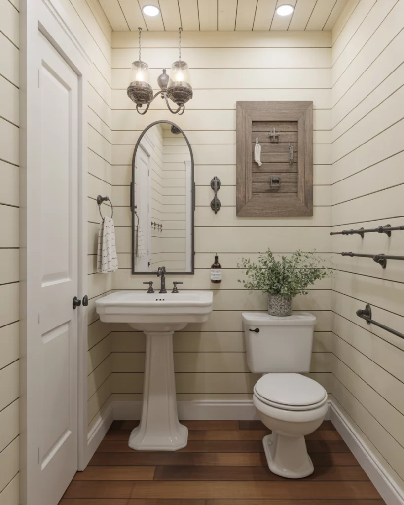 For a rustic yet crisp look, install vertical or horizontal shiplap panels in your half baths. Combine it with matte white colour paint, cast iron hardware, and old-fashioned pedestal sink. Put a sliding barn door to add to farmhouse feel. Joanna Gaines often promotes this style for its inviting and authentic character.