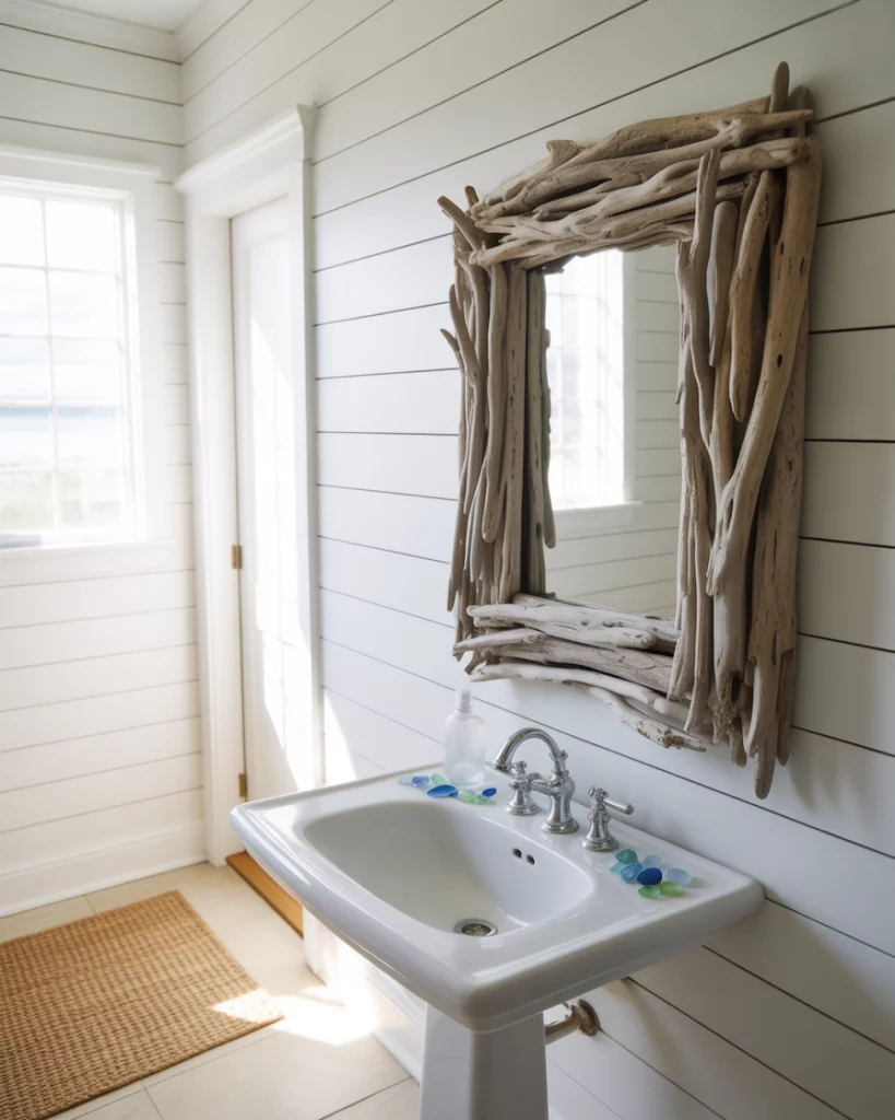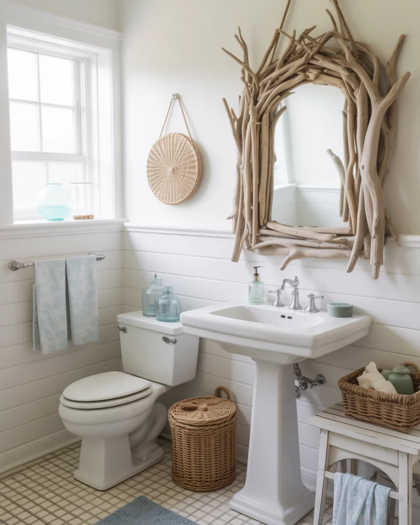 If you’re near the sea—or wish you were—coastal design brings a breath of fresh air. Consider fresh white walls, beige sand paint, drift wood mirrors and sea glass style accents. Only add striped towel and a modern pedestal sink and a vacation-like instantly appears. This works especially well in homes with existing half baths modern layouts, adding softness and charm.