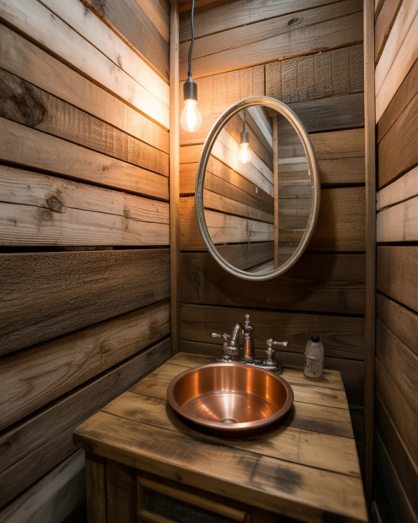 Bring the outside in with a rustic powder bathroom that feels warm and welcoming. Use reclaimed wood, stone finishes, and hammered copper sinks. Small rooms can use a healthy dose of texture: weave baskets or an old bronze drawn handle. These half baths feel timeless and personal, like a cabin retreat in the woods.