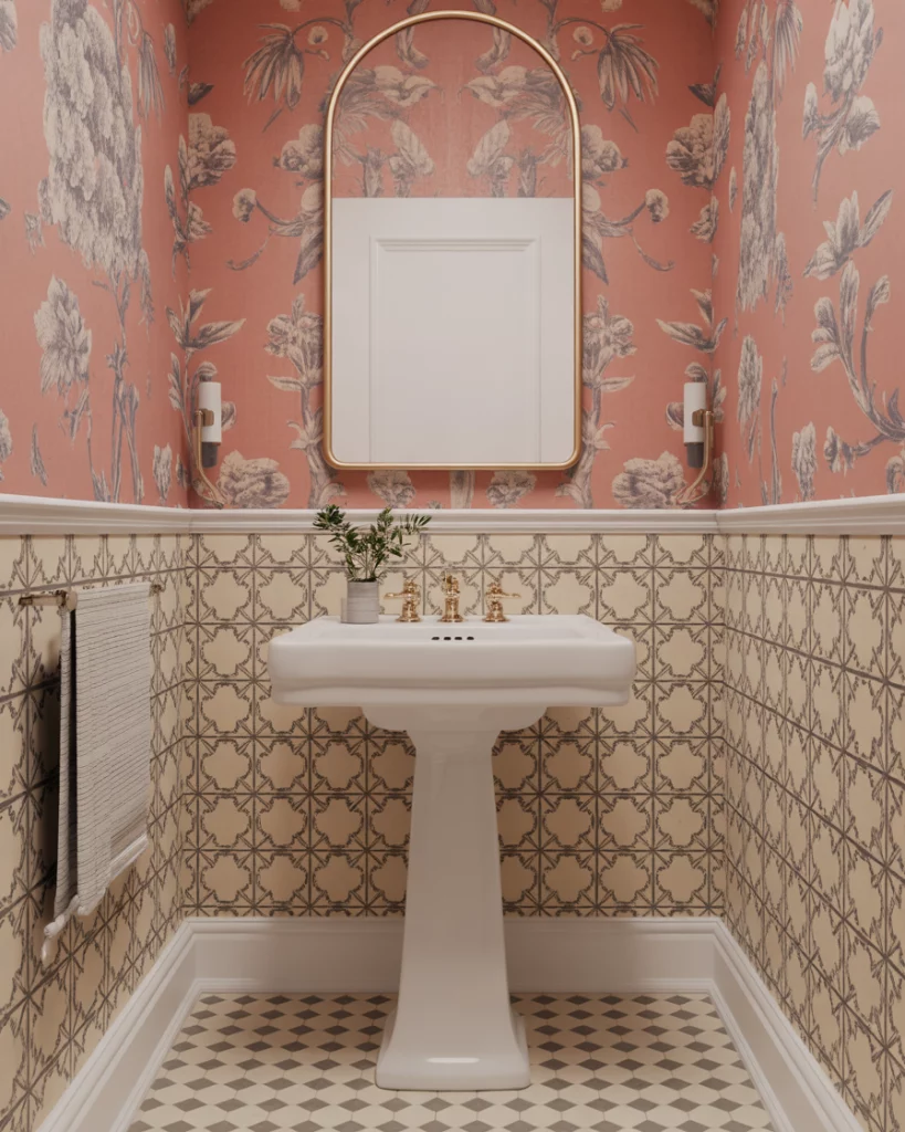 Want your guests to smile when they enter? Put a twist of fire by a striking wallpaper; Picture flamingos, jungle leaves or vintage flowers! They do not feel overwhelming because the overall patterns are large since a half bath is small. Place it with a pedestal sink and it makes the pair a showstopper. Author and designer Justina Blakeney often encourages fearless pattern mixing in small spaces for “joyful visual impact.”