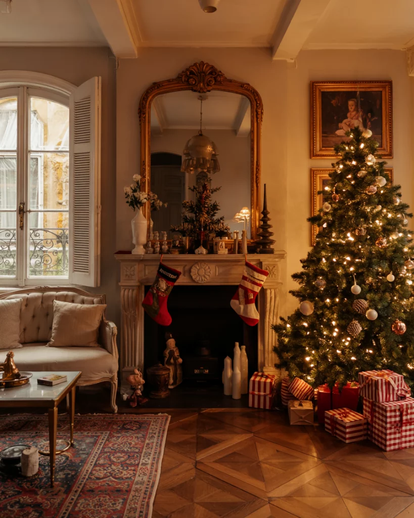 Simple Scandinavian Christmas in the form of a charm with a simple apartment. Light woods with high amounts of whites and heavy amounts of soft greys with slight bursts of red. The style suits a small apartment well, where space is small and taste is huge. Put a small tree on your coffee tables coffee tables, put fairy lights that are in curtains to keep the room warm, and have woven baskets with blankets near the fire places simple easy setups.