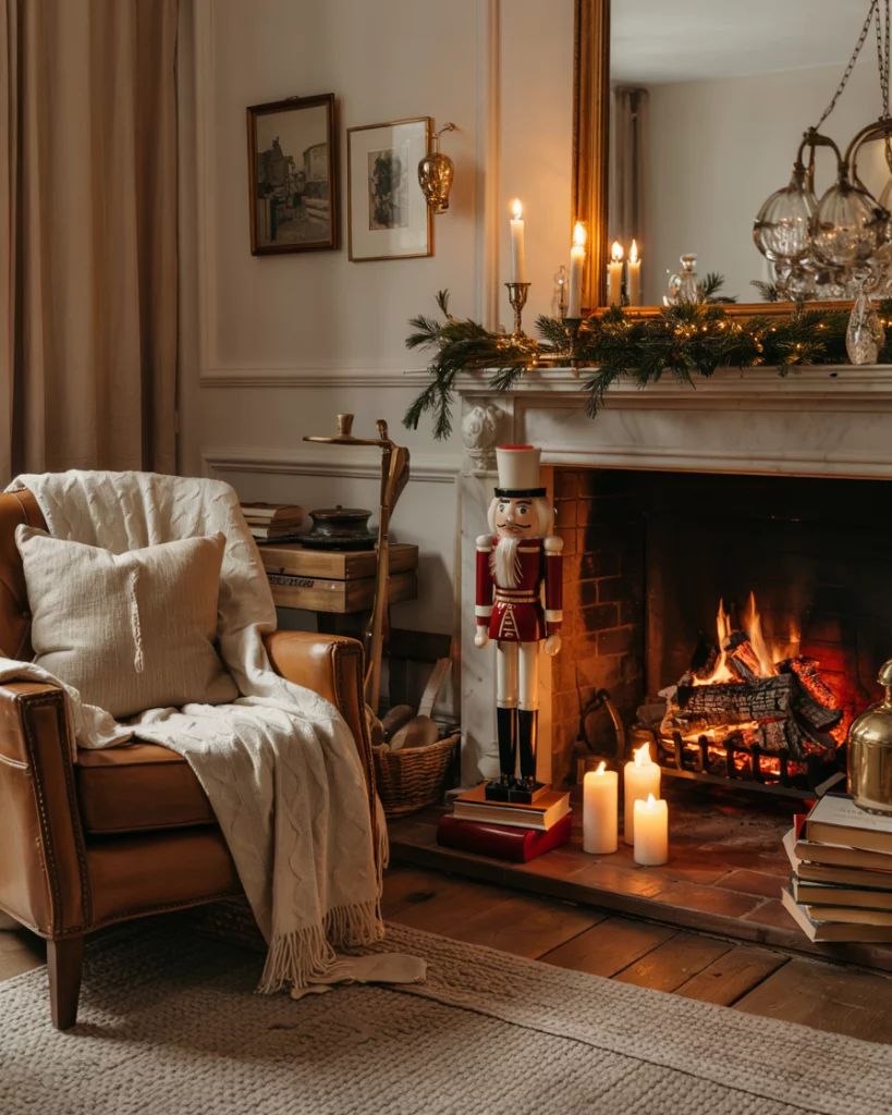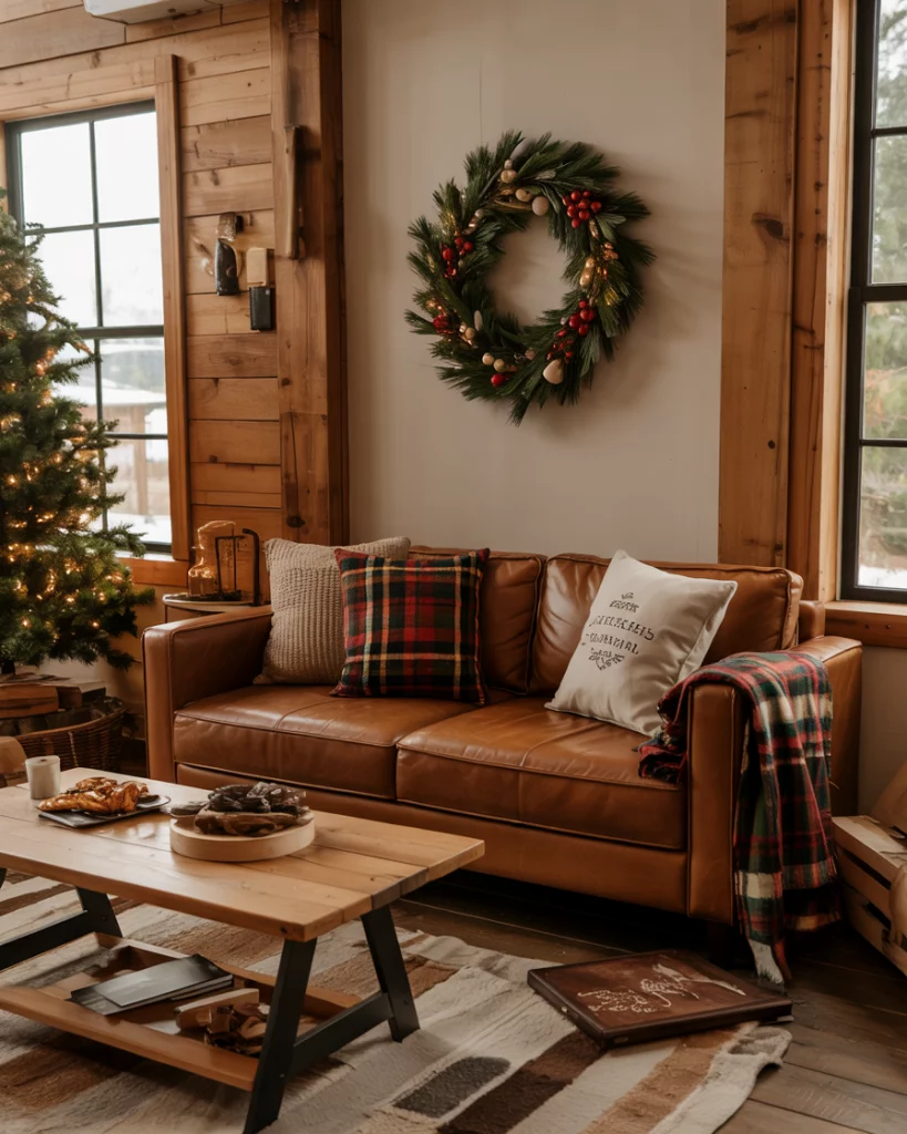 When you are in love with the outdoors, be rustic. Consider buffalo plaid, unpolished wood, and crafty details that scream cabin. Perfect, especially in a home that already has a brown leather couch, layer thick blankets and hang pine branches behind framed pictures on the television wall. Hang an antler wreath and make the fire places simple easy logs, fairy lights, a touch of cinnamon smell are all you need.