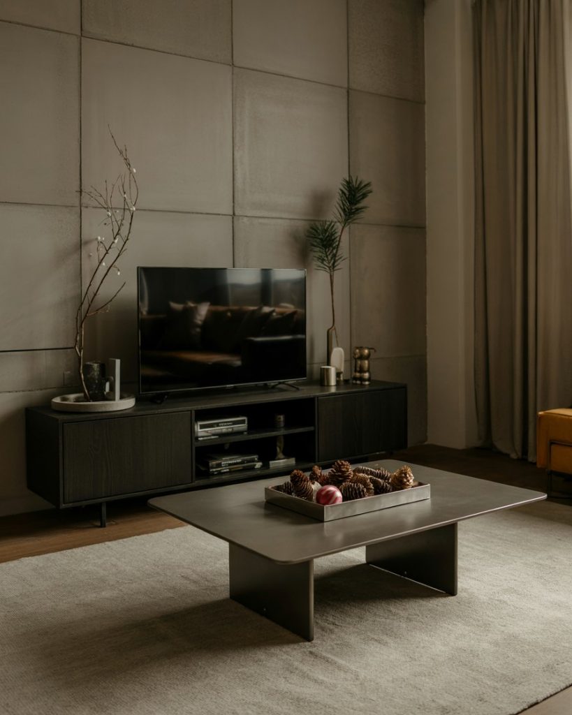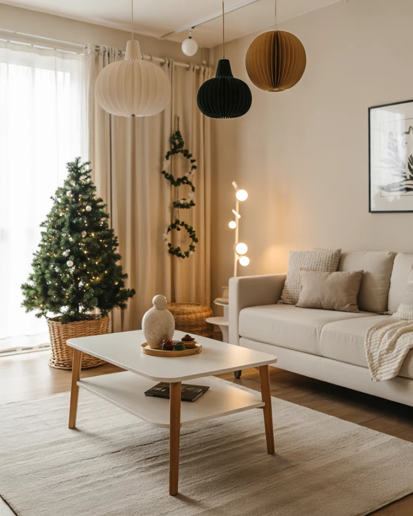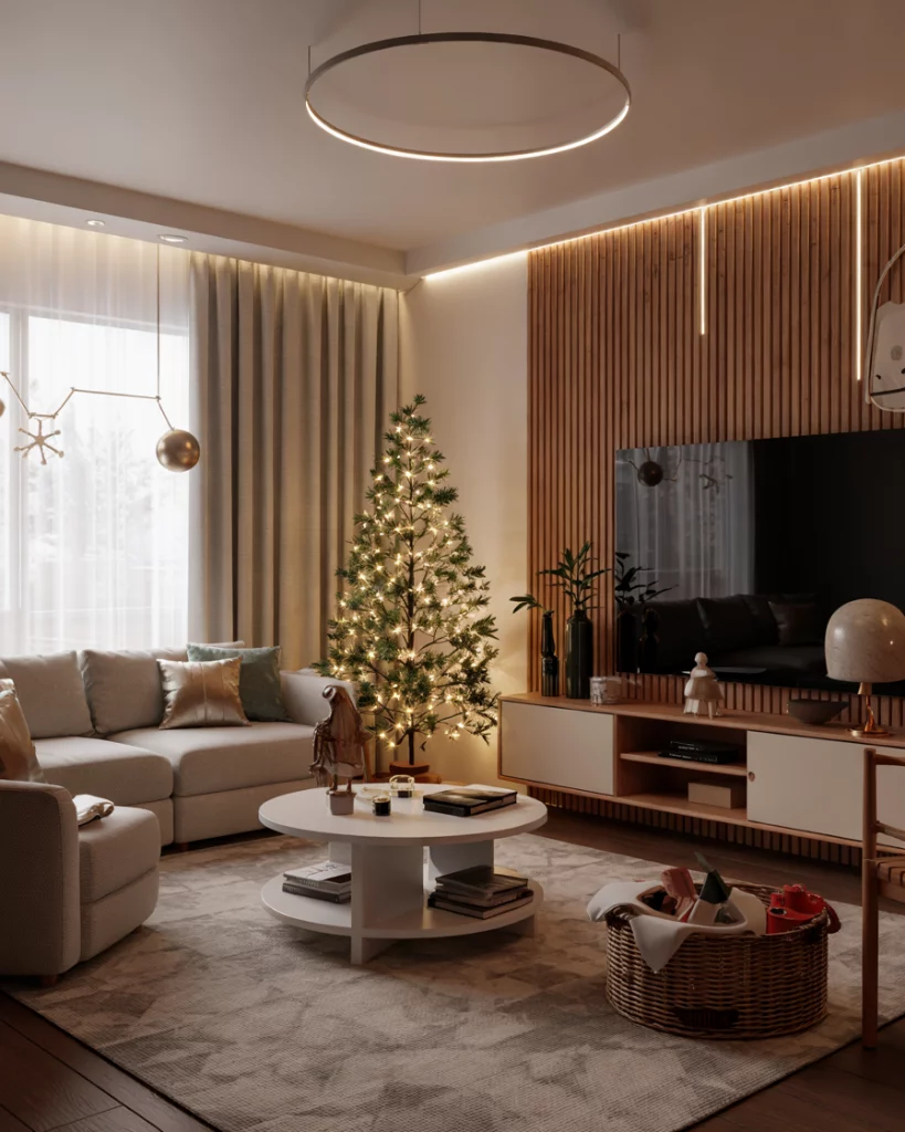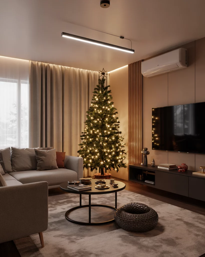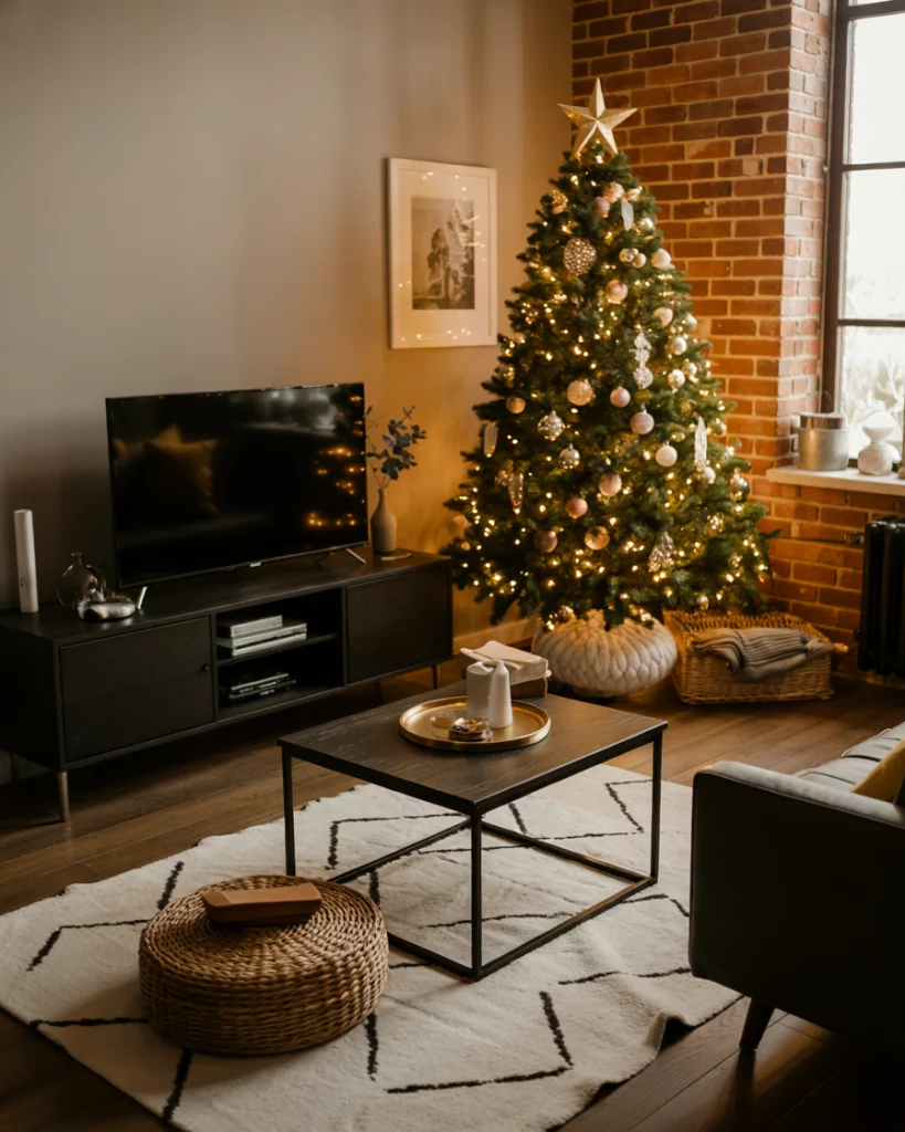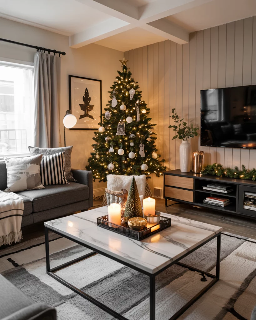 Minimalism in silhouette, metallics, Edison-style bulbs in a city apartment modern cozy or industrial loft to make the look edgy-Christmas. Raw wood accents, iron candle holders and black or charcoal tv cabinet provide a stylish contrast to soft lights and greenery. The style glistens with relaxed, practical item and lifted coffee tables decorative trays Christmas decorations.