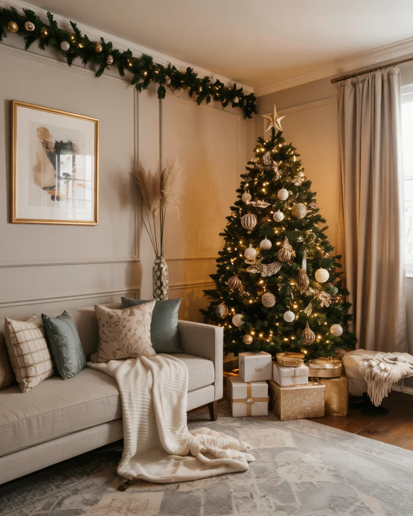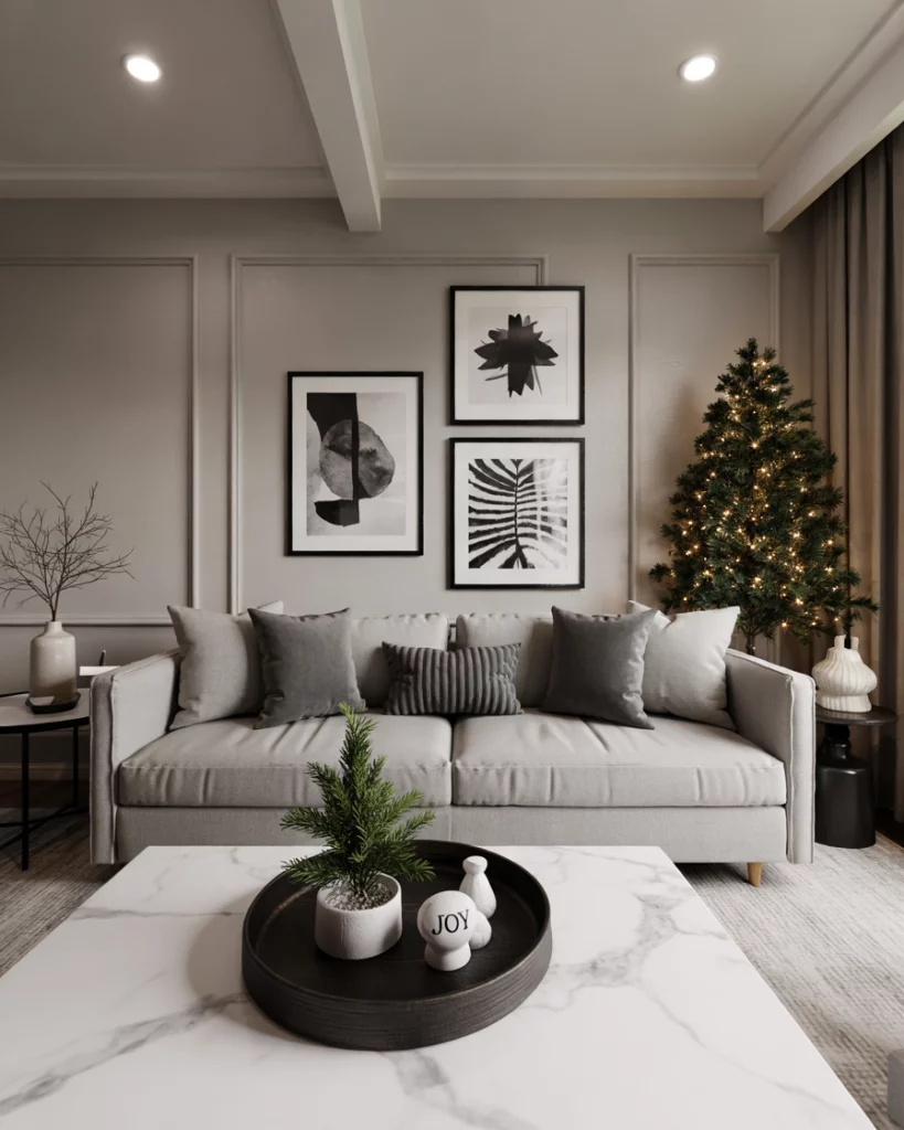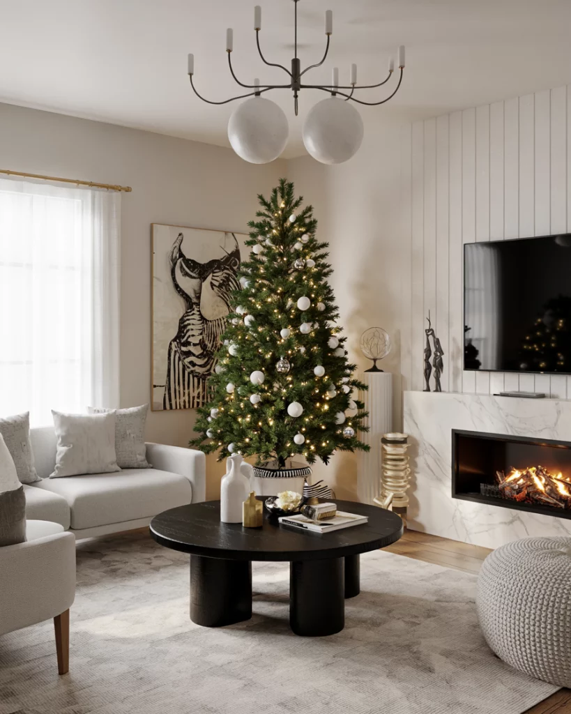 To design-forward thinkers, mix avant-garde elegant framework with aesthetic modern restraint. Have a palette of all black or all white with heavy sculptural features. The presence of a sculpted tree with matte ornaments, asymmetrical garlands, and abstract art on the tv wall produces a gallery atmosphere. Apartment modern luxury: perfect with bold decorators.