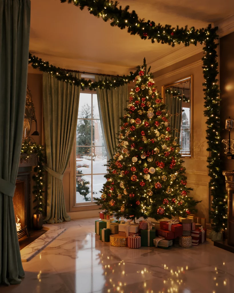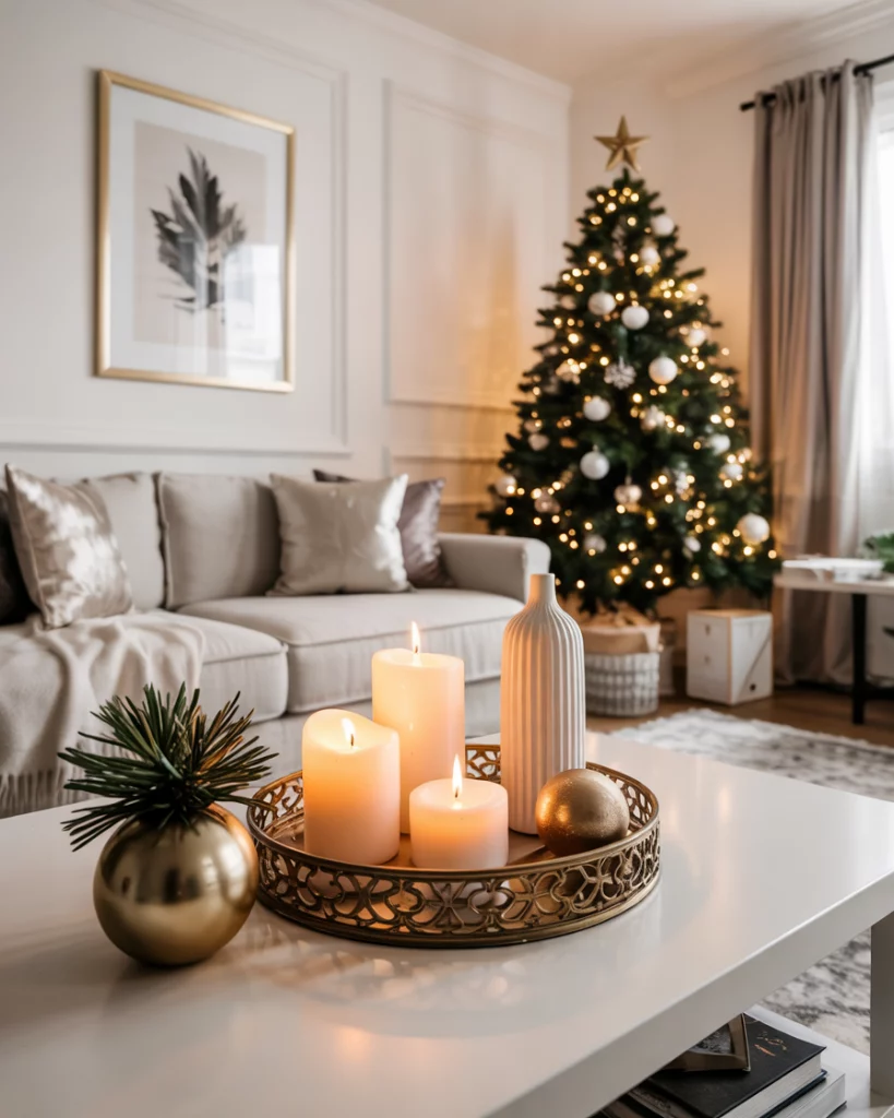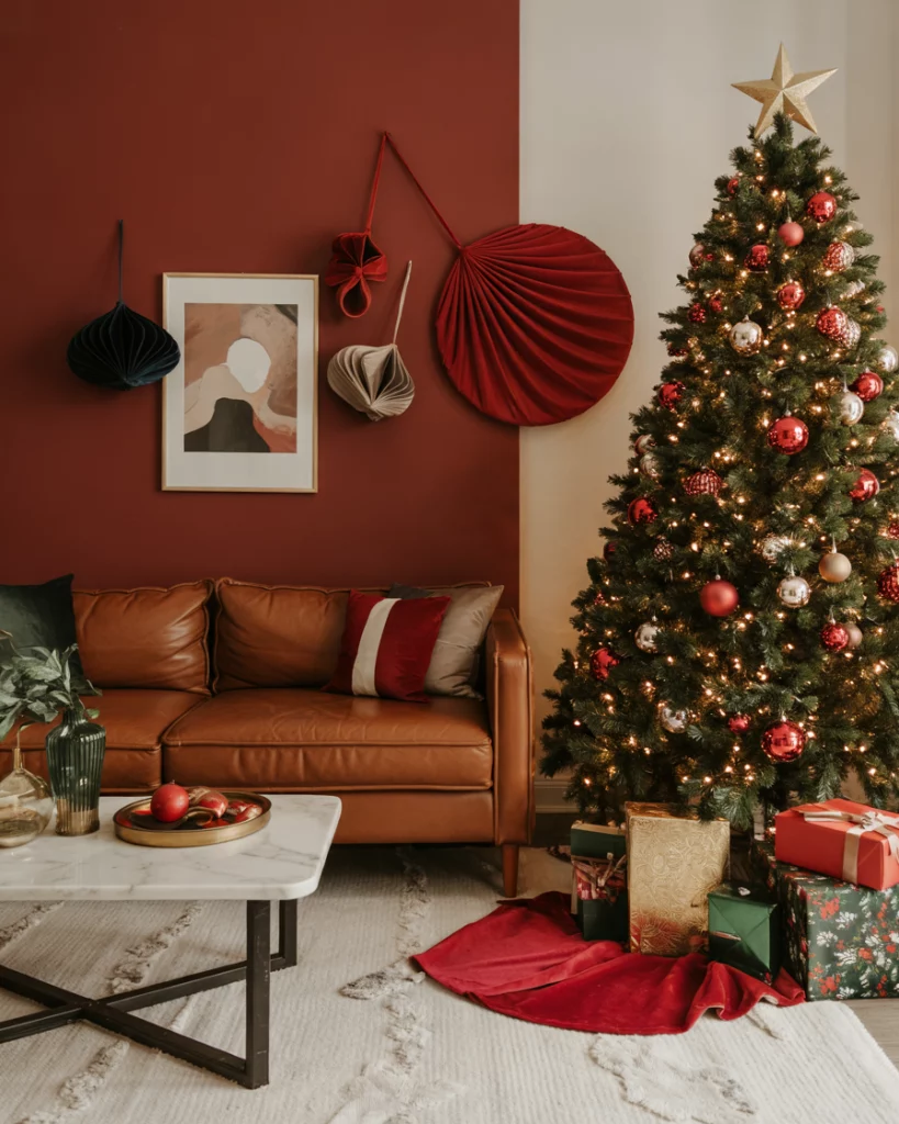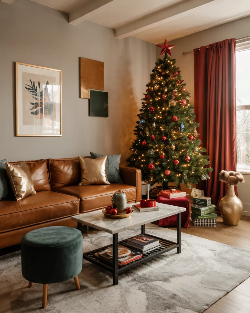 Fill your space with deep jewel colors–emerald, sapphire, and ruby–to have a luxurious Christmas appearance. Hang heavy curtains, pile velvet cushions on your brown leather couch, and sprinkle it with metallic garlands. The tree is a deep green and is adorned with gold and red, making it look like a royal tree, and the coffee tables are decorated with trays that can be used to set up Christmas decorations with crystal ornaments.