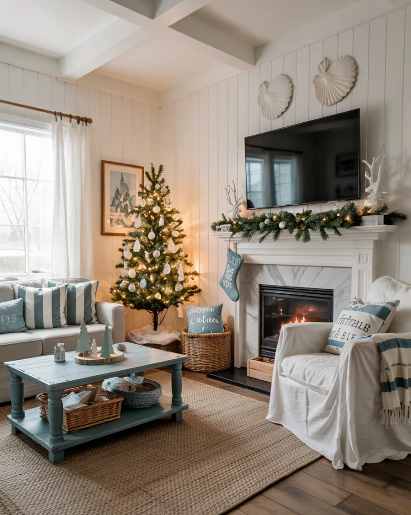 Take the beach home with a coastal Christmas theme– light blues, sands, and driftwood. Fits well in a small apartment or beach house, replace the color red and green with seafoam and cream. The look is finished off with a driftwood tree, seashell garland and a TV wall adorned with string lights and glass baubles.