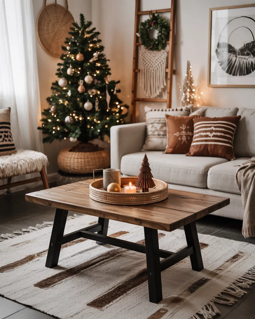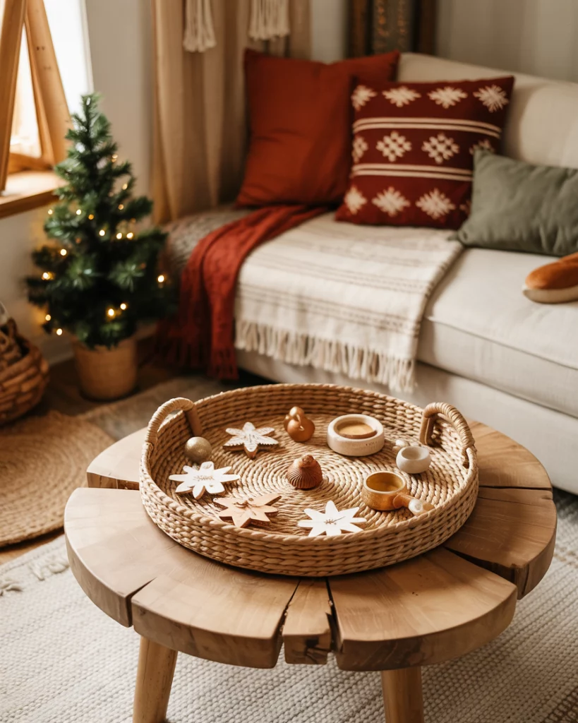 This style is full of texture, crafted materials and a natural color palette. Fits well in small apartment rooms, combine textiles with tribal motifs, wood bead garlands, and terracotta decals. Hang orange slices and homemade handmade ornaments. Everything is joined by a low-lying coffee table ornamented with woven decorative trays.