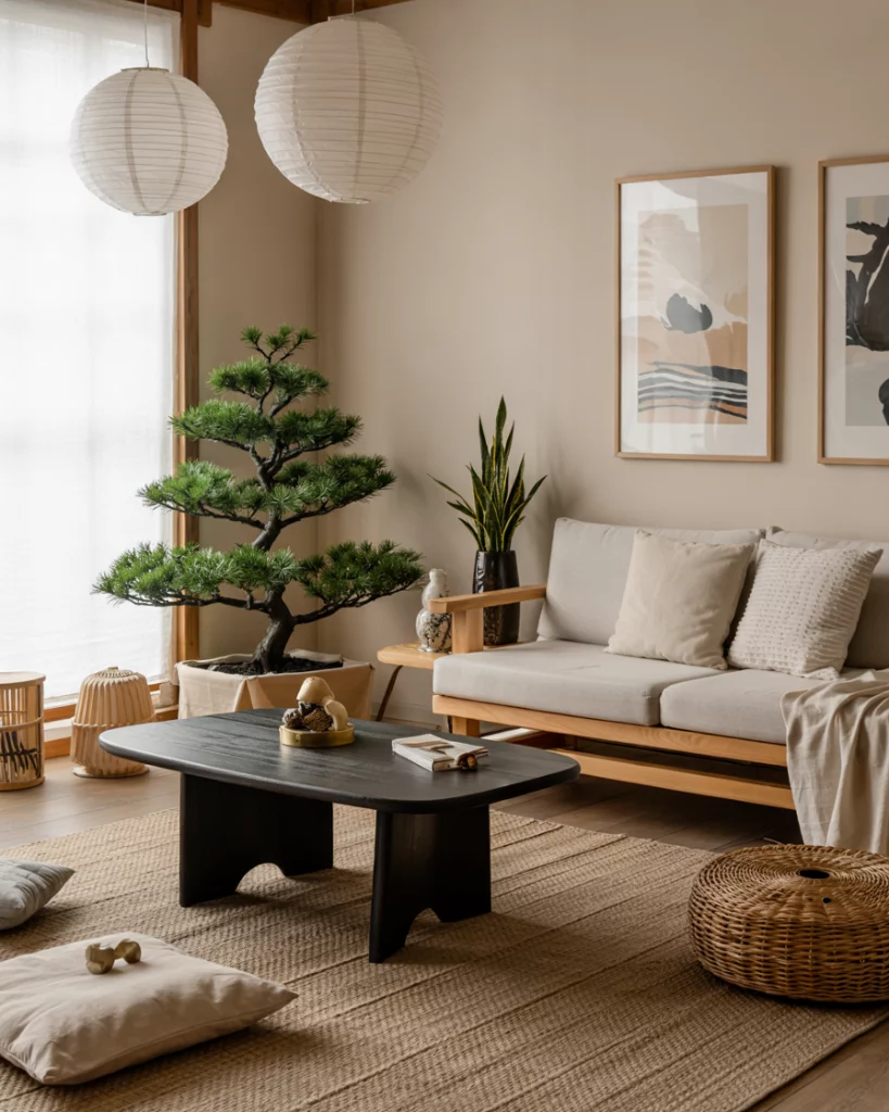 Create a peaceful environment in your home with Japanese minimalism. Make use of natural objects such as bamboo, bonsai trees, and plain white paper lanterns. The tone is established by a tatami mat under a coffee table, gentle light, and neutral colors. This is perfect in the apartment modern luxury environment where people want to relax and have a balance.