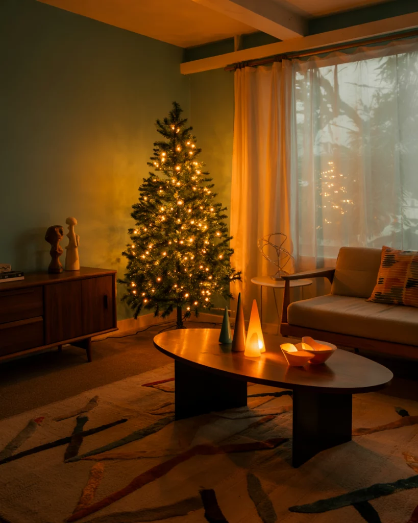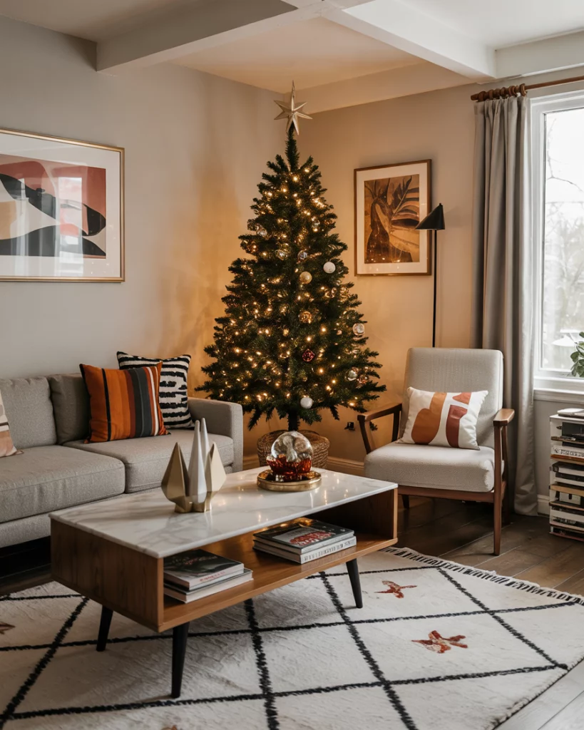 Christmas decorations go hand in hand with the clean lines and iconic shapes of the mid-century modern design. Retro ornaments, atomic stars, and a tinsel tree. Decorate your coffee tables with sculptural candle holders and color. This appearance is excellent among those who like vintage in apartment modern cozy living areas.