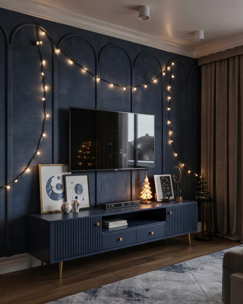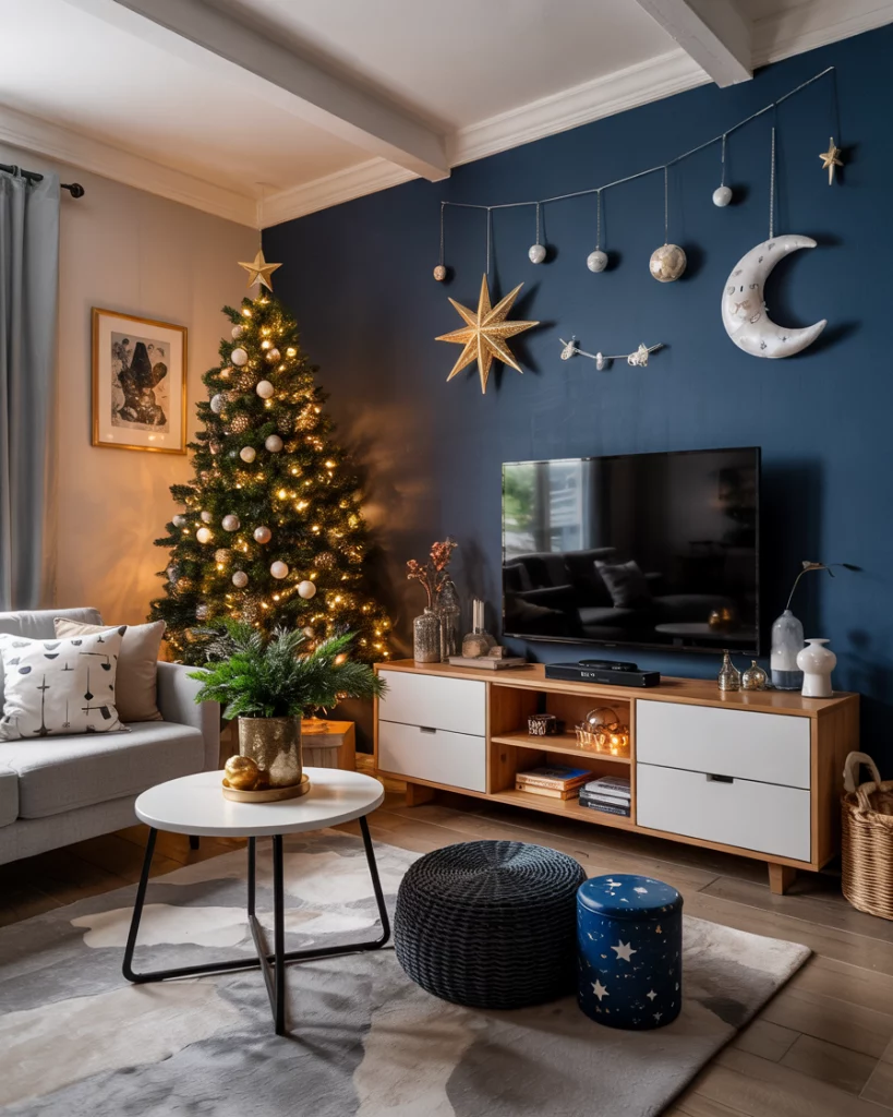 Get the inspiration of the night sky with a heavenly Christmas theme. Take moon and star patterns, navy and gold color palette, and galaxy-themed garlands. Hang metal stars on your ceiling or hang them around curtains. Create a tone that is dimly lit on the television wall and dark blue on brown leather couch.