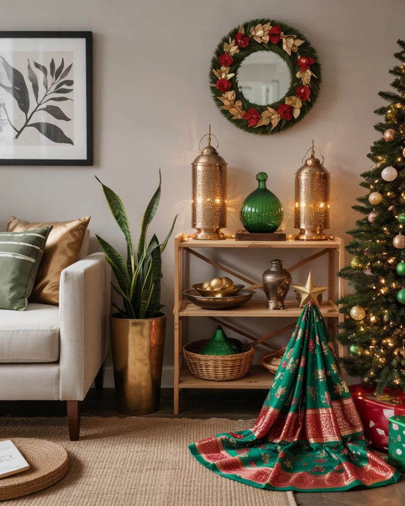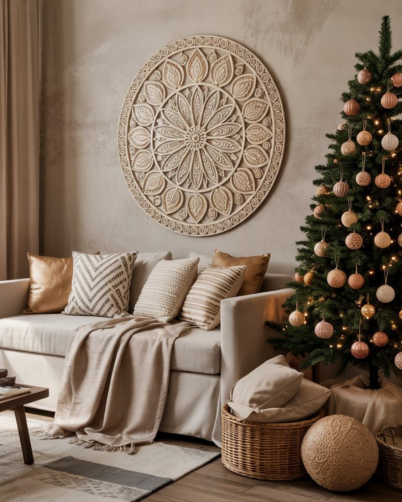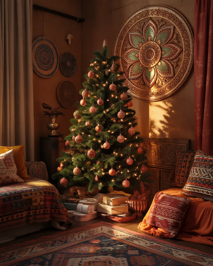 Combine Indian folk art and rustic Christmas to give it a soulful appearance. Hang mandala-like wall decorations around your television set, brass candleholders and garlands of handwoven fabrics. The nakedness of the tree is enhanced by a few painted terracotta decorations. Fits perfectly in small apartment designs that have cultural appeal.