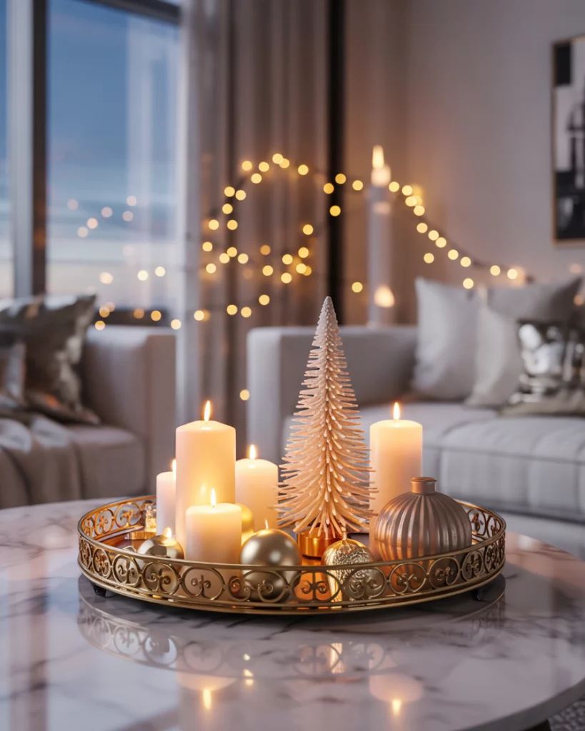 White gold decor would provide a clean and luxurious look to those who are attracted to the sleek, modern look, yet still festive. This is particularly effective with apartment modern luxury where less is more. Imagine gold-dipped pinecones, black stockings and a small television cabinet with fairy lights. Place soft white throws on top of your couch and use coffee tables as decorative trays setups using gold candles and geometric ornaments when you want to look classy at Christmas.
