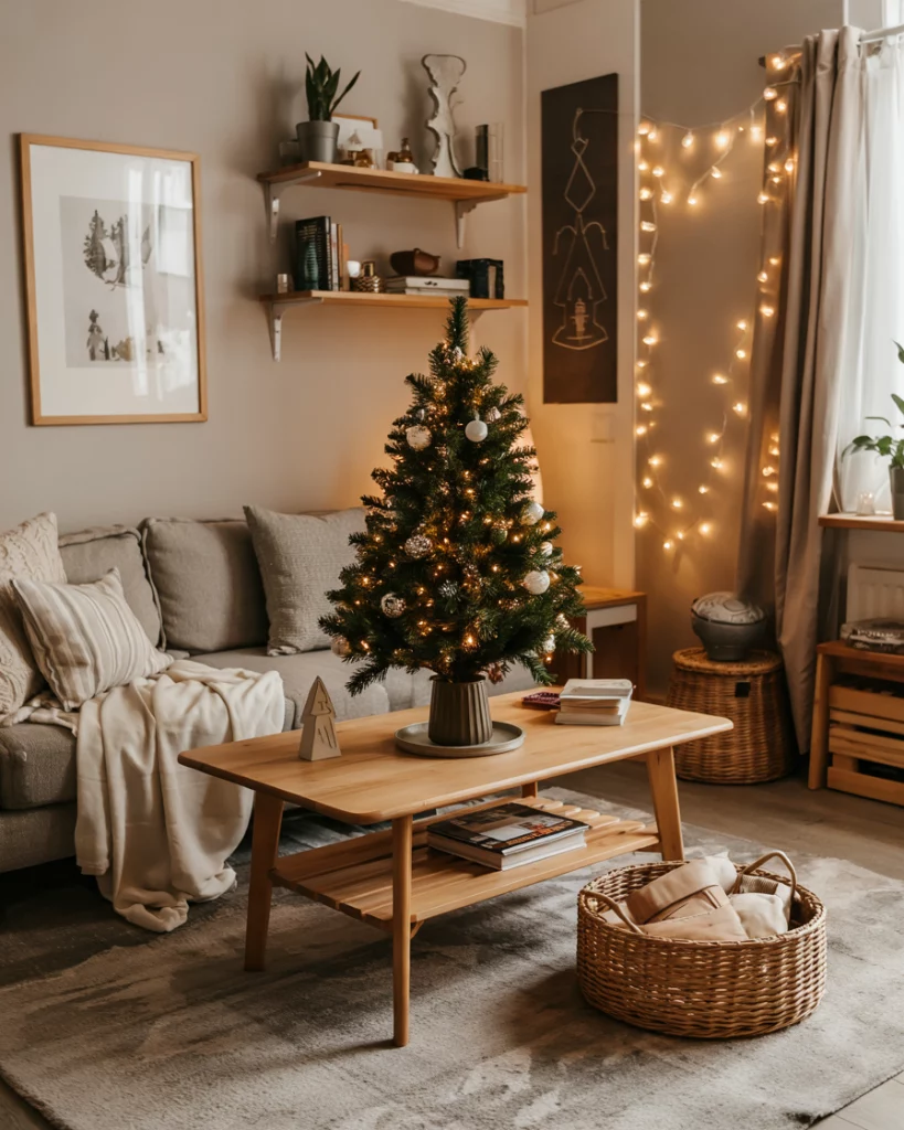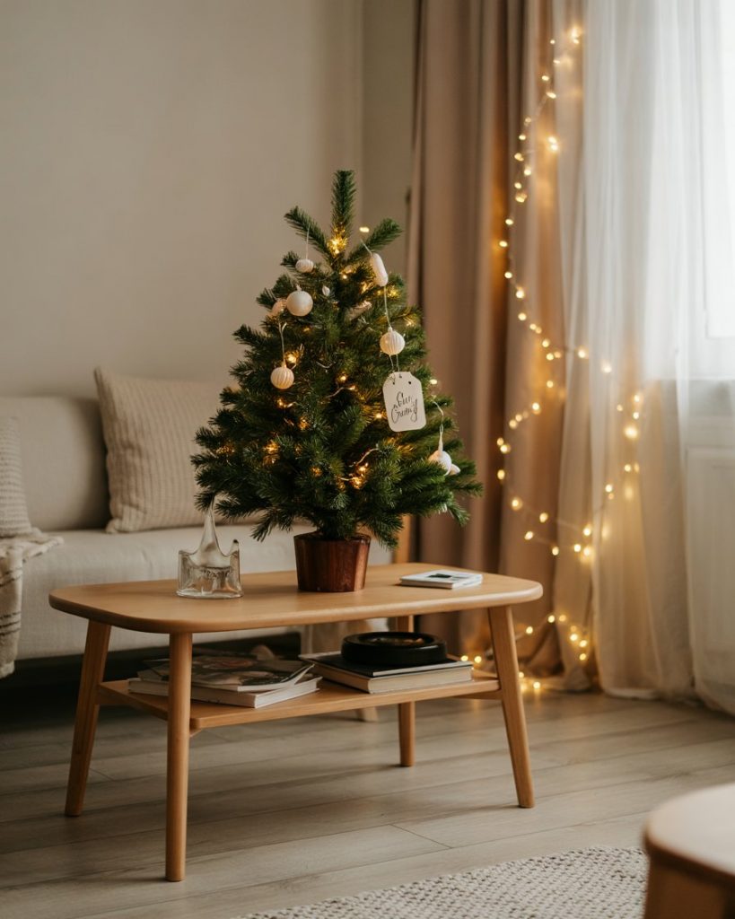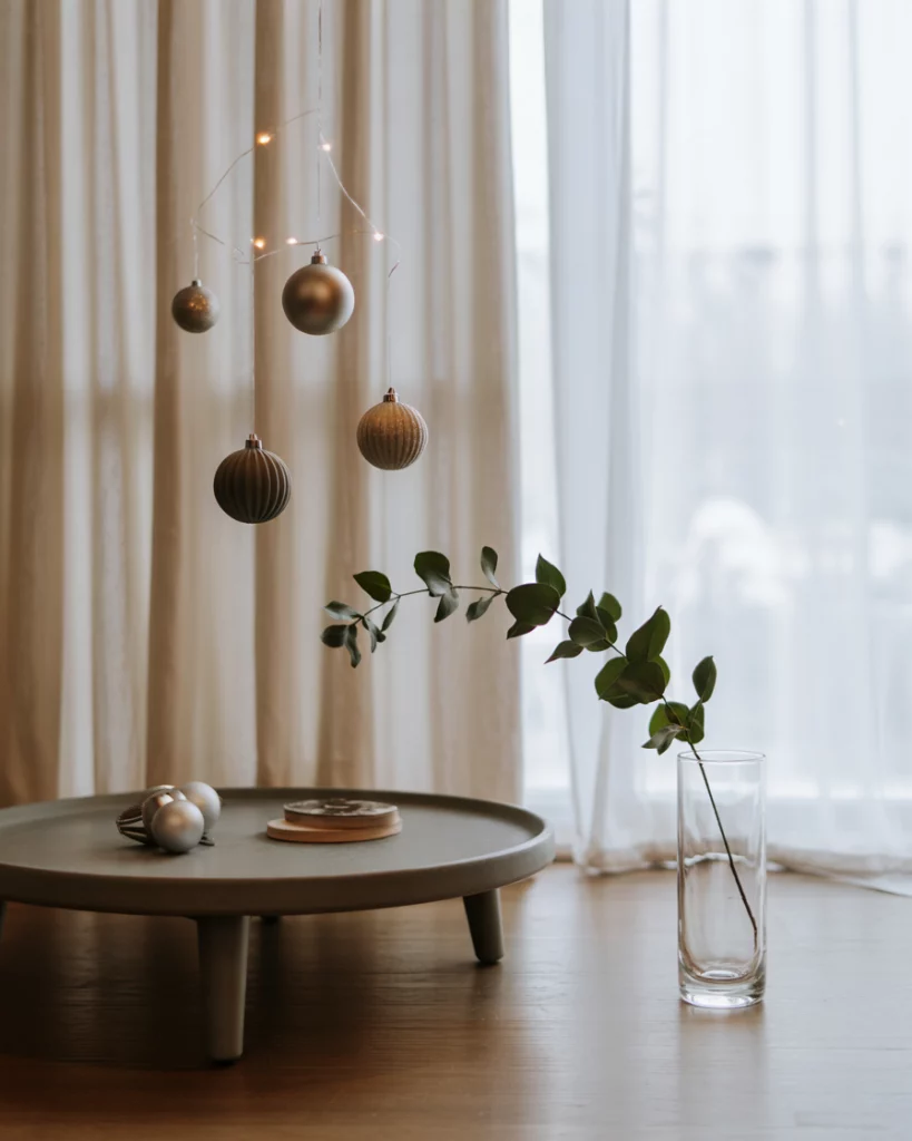 Rather than decor on the ground, hang up baubles, greenery or floating trees in the air with wire and ornaments. Ideal in small apartment situations where there is a limited amount of floor space. Hang things that attract the eye upwards in the space above your coffee tables or in areas as long as your curtains. Make the rest of the space as simple as possible.