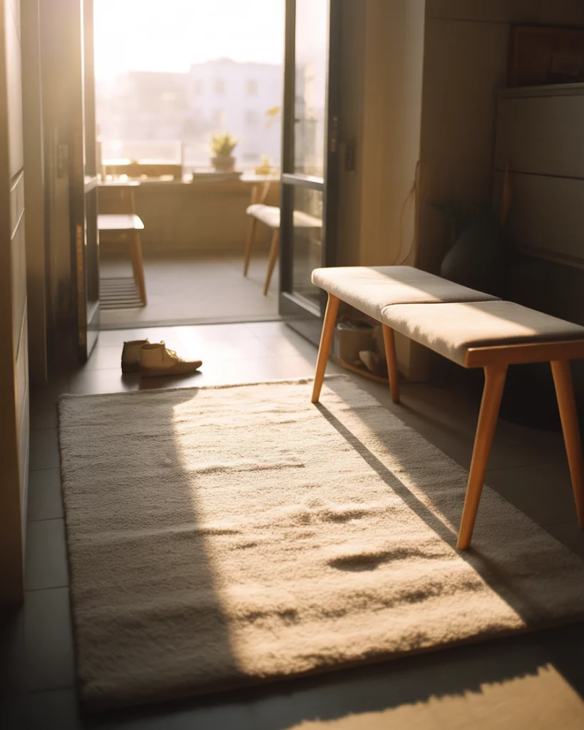 Carefully selected and designed rugs help to define the entrance to the apartment and the ensure the protection of the floors for the high traffic zones of the rug. Low pile rugs that are easy to wash are prevalent in entryways that have storage in rug systems. In Designer’s opinion the placement of the rug should be to the outsides of the door’s jams to help to visually remove the edges of the entry.