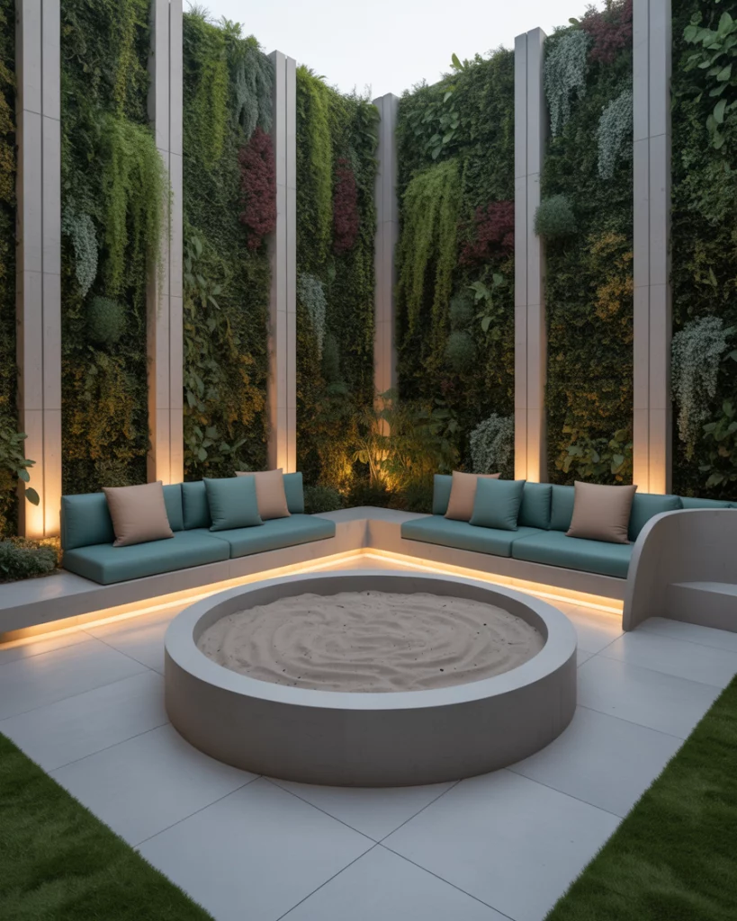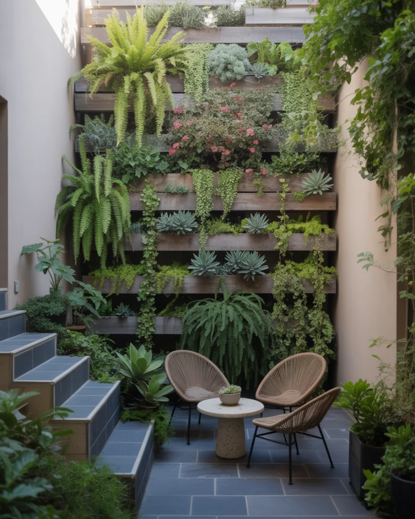 A vertical green wall uses upward space, ideal for a budget easy diy simple garden design that fits narrow yards or townhouse backyards. You can mount planters or modular pockets to a fence or wall and plant herbs, climbers, or succulents. This approach gives depth without losing ground area, works in renter friendly settings when using removable systems, and blends beautifully with a cozy seating niche at the foot of the wall.