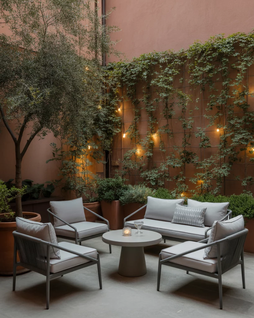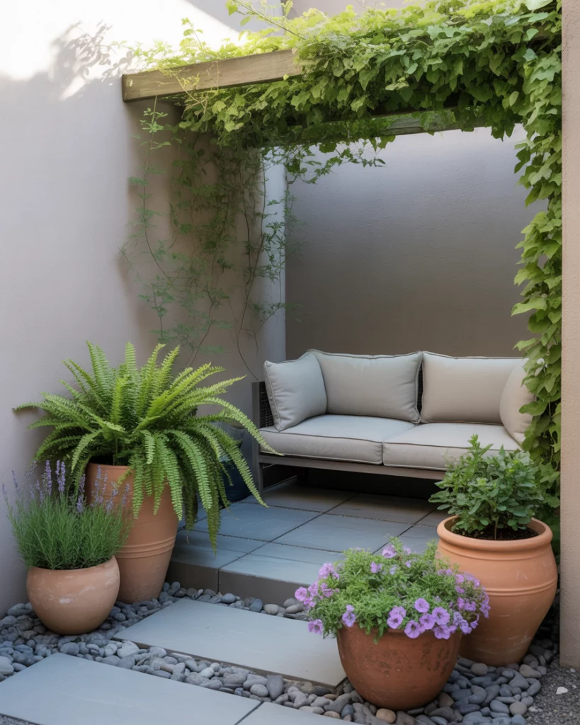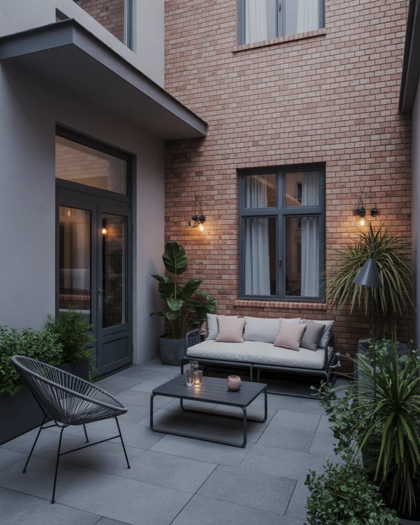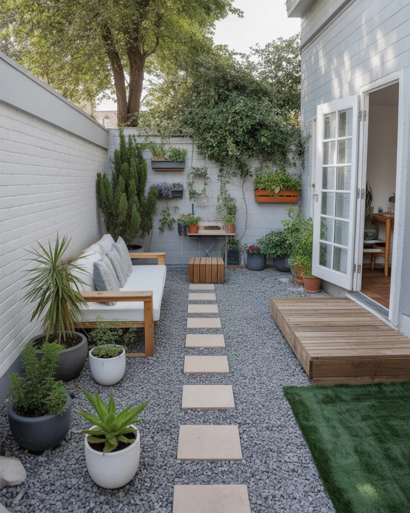 For those wanting a budget no grass patio garden design, swap turf for pavers, gravel, or permeable tiles. Fill gaps with creeping thyme or low groundcover, then anchor with potted plants, container trees, or vertical planters. This cuts maintenance and is perfect for renter friendly properties (containers, no major digging). Add strings of lights and a small table to make it cozy.