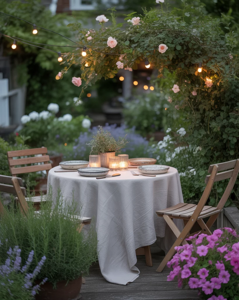 Nothing beats dining under twinkling lights. Create a garden corner with a simple table and chairs on gravel or decking. This on a budget easy setup feels like a mini bistro at home. Hang fairy lights, use repurposed jars for candles, and plant herbs nearby for scent. It’s kid friendly for family dinners and a romantic spot for couples alike.