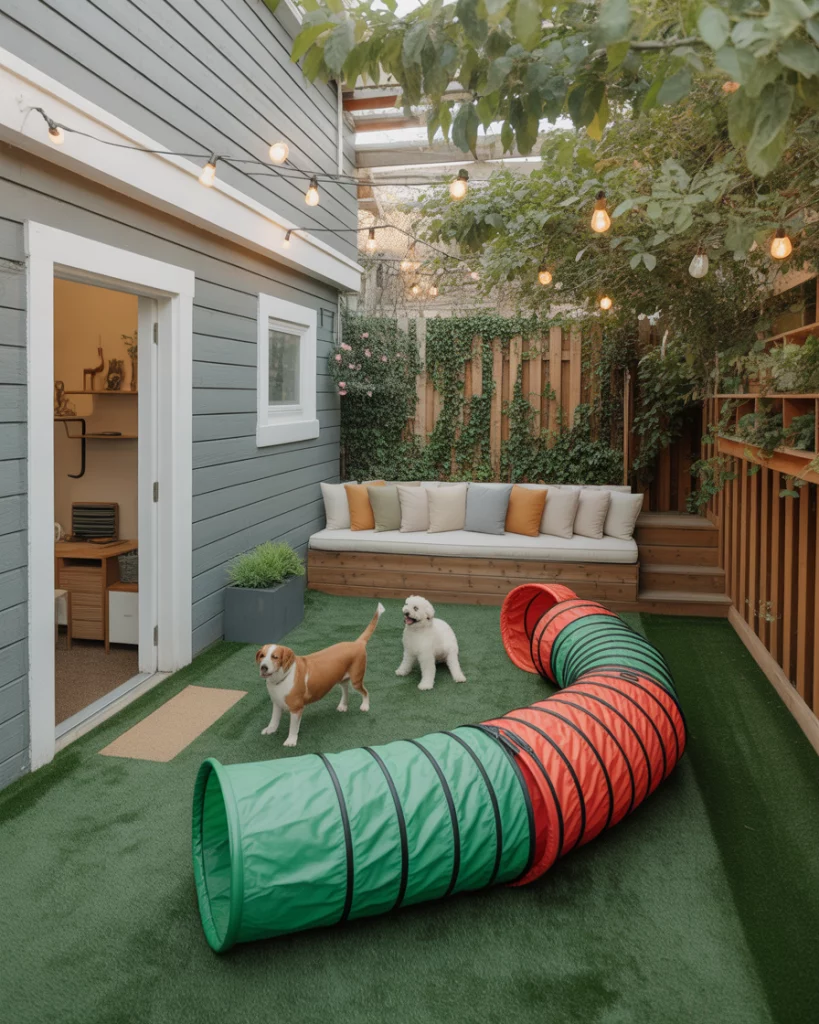 Design a dog friendly and kid friendly zone with artificial turf, agility tunnels, and shaded seating. Keep it on a budget easy with simple fences, play mats, or wooden barriers. Add a small patio for parents to relax nearby. Many homeowners now combine play and relaxation spaces so everyone—dogs, kids, and adults—can enjoy the backyard together.