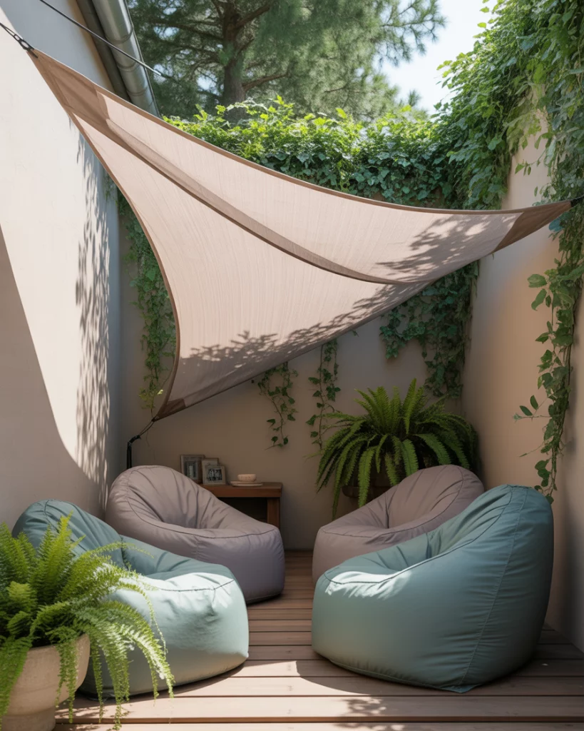 Install a colorful shade sail over a corner of your patio or garden to create instant comfort. It’s on a budget, renter friendly, and adds visual drama without heavy construction. Combine it with soft beanbags or outdoor poufs for lounging. This modern idea also works for kids to play safely away from the sun—simple and stylish all in one.