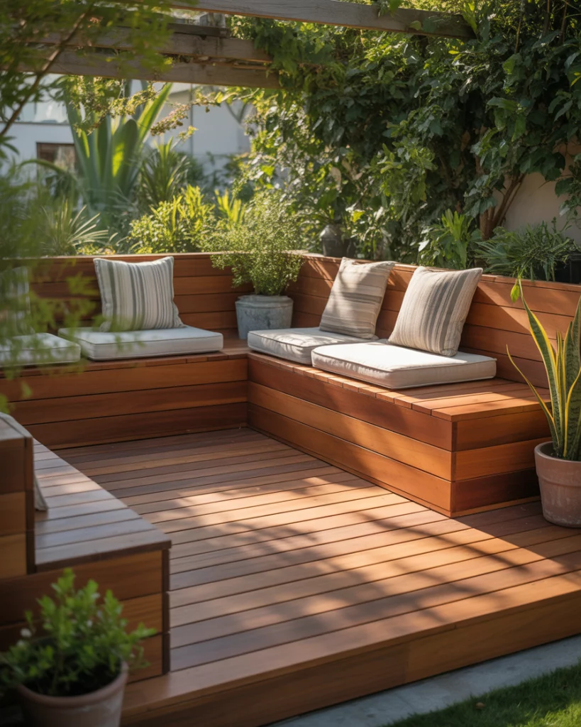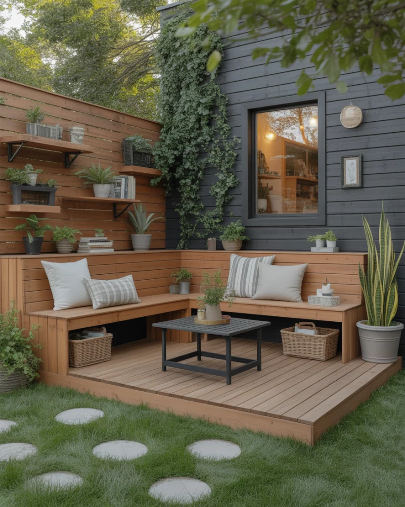A small deck built flush to your home or raised a few inches can transform a patch of lawn into a defined living zone. Add built-in benches with storage beneath to serve as seating and hide pots, cushions, or kids’ toys. This is on a budget, since simple lumber boards and brackets suffice. It’s dog friendly and kid friendly too—no loose furniture. Use planters or low landscaping along edges to soften the deck’s lines.