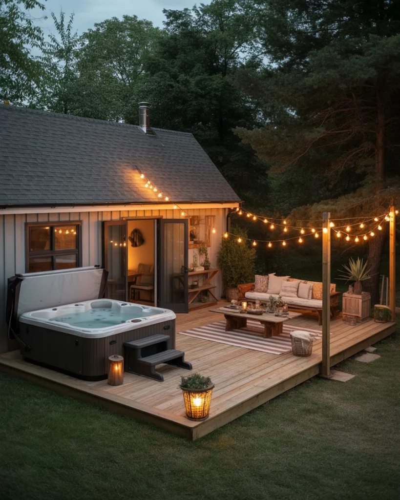 Combine a wooden deck, string lights, and a small hot tub for a rustic retreat feel. This a budget easy diy projects farmhouse style suits both rural homes and townhouse yards. Add vintage lanterns and a few climbing vines for privacy. The warmth of wood and water makes it cozy, intimate, and perfect with hot tub evenings under the stars.
