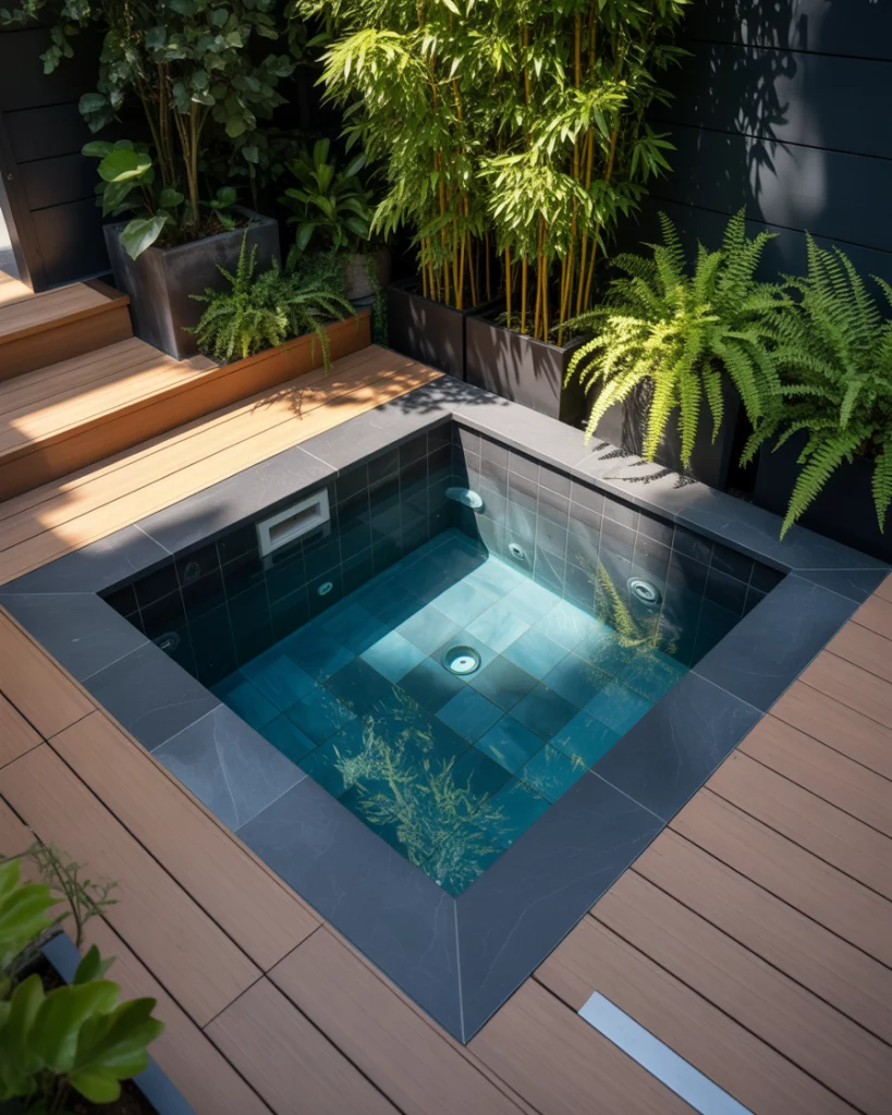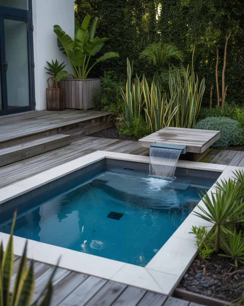 Even small backyards can house a mini inground pool or plunge pool (or water feature) to bring a sense of luxury with pool appeal. A shallow soak zone or narrow trough pool fits in slim plots and serves as focal point. Surround with composite decking or pavers and add minimal landscaping like grasses or bamboo for privacy. This raises property feel without overwhelming scale.
