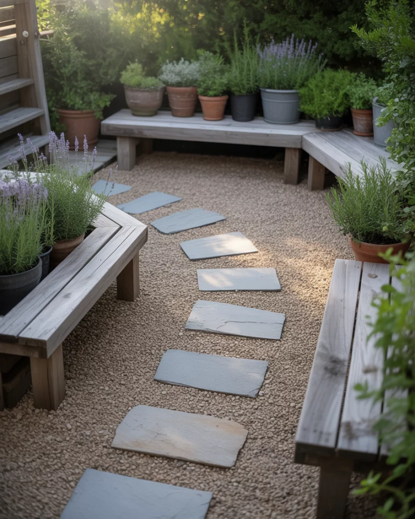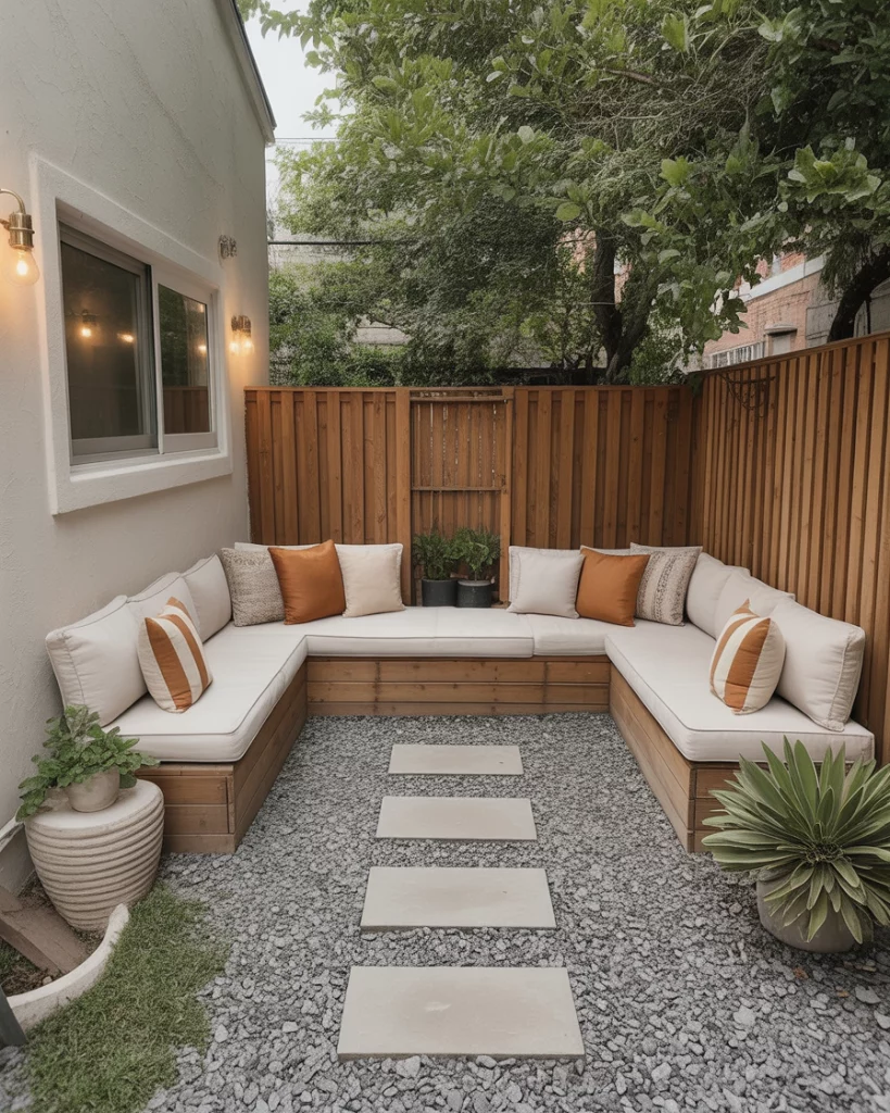 Gravel is cheap, permeable, and adaptable. Combine a budget easy DIY gravel base with stepping-stone pathways and pocket seating corners (a bench or hammock). Surround seating with potted shrubs or low landscaping to frame the space. This design suits dog friendly, kid friendly, or renter friendly yards because nothing is permanent or too labor-intensive.