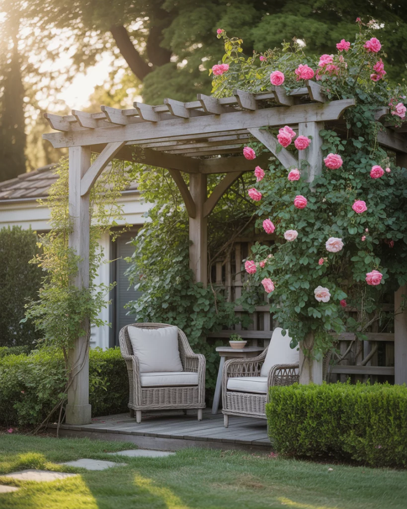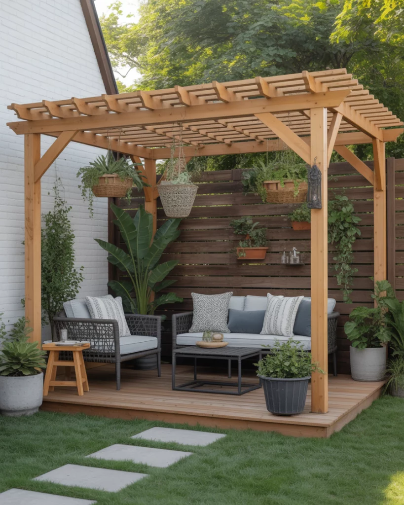Even a small pergola or arbor can turn a backyard into a shaded, cozy room. Grow vines or hang planters to soften its frame. Underneath, place a patio table or lounge chairs. This structure adds height and vertical visual interest and works with kids and dogs as long as materials are durable. Use a budget DIY simple garden design by building your own frame from treated lumber or kits.