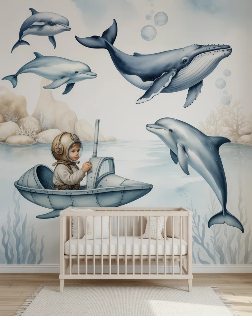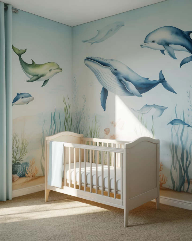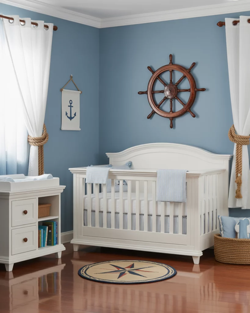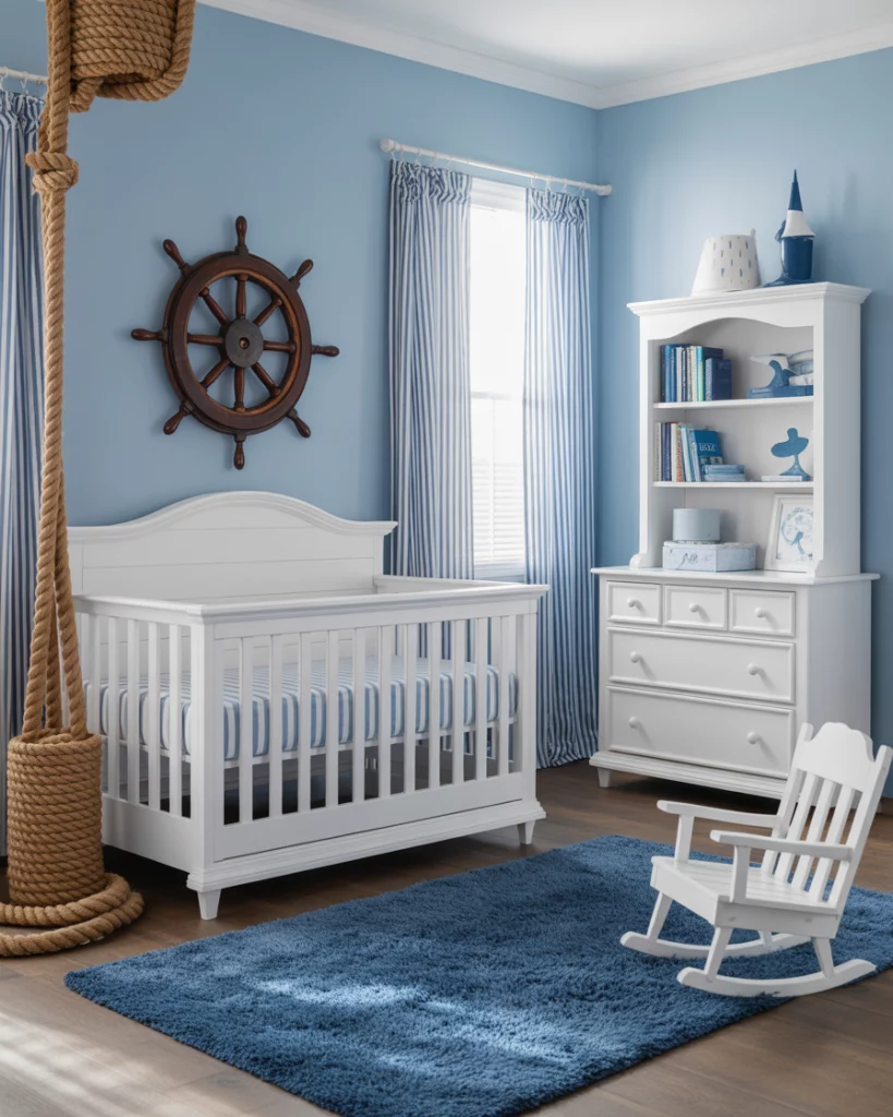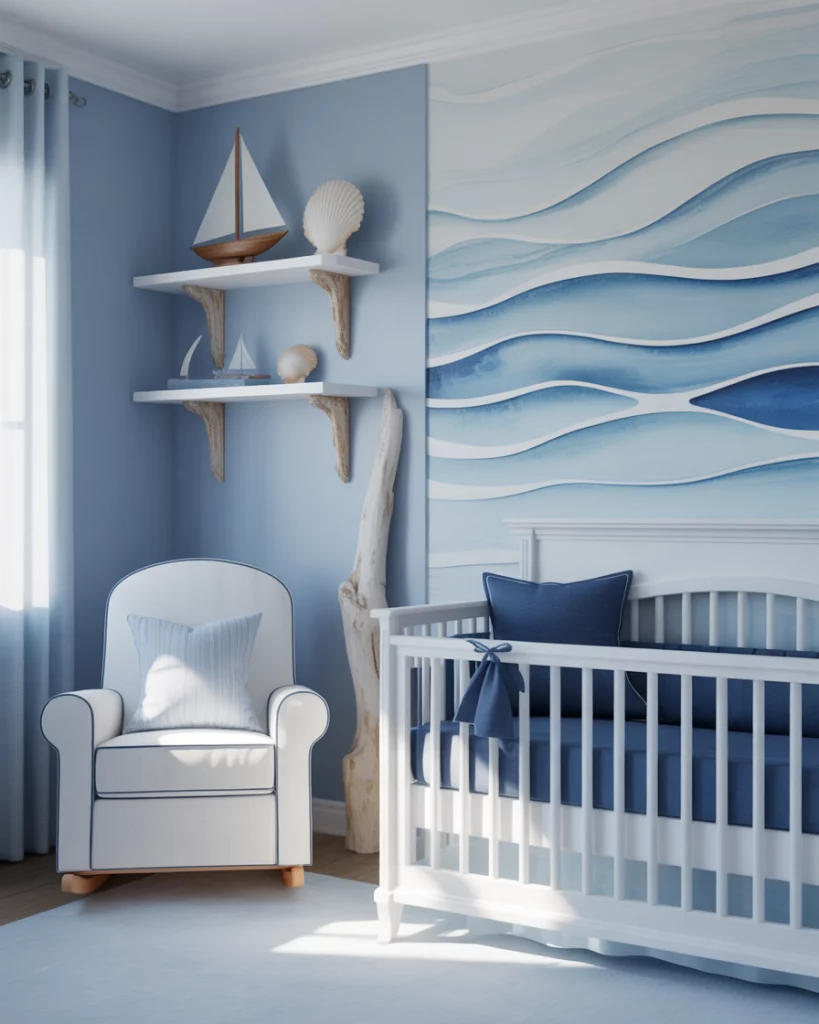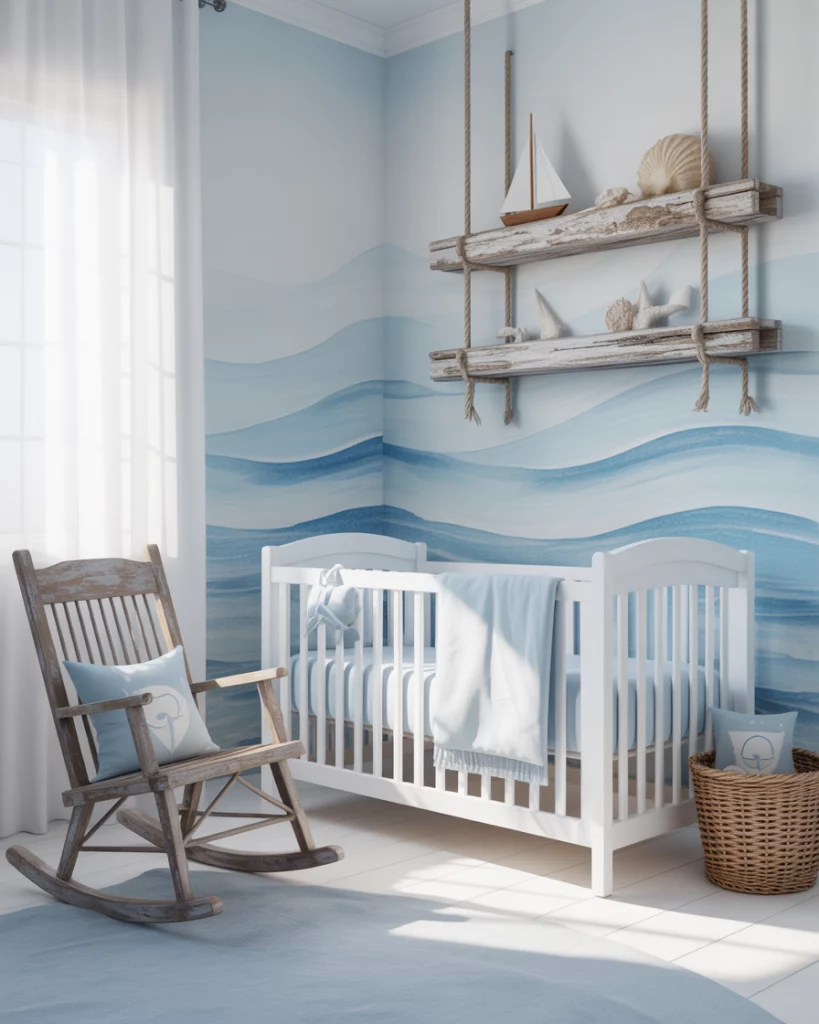 Creating a nursery for parents loving the coastal look, using the airy blues, sandy tones, and white furniture will create a nursery that is peaceful. Visualize a white crib standing proudly in a blue sky wall, along with jute rugs, driftwood, and suggestions pointing to the ocean theme through wave murals on the wall, seagull cut-out figures, or beyond. This could traditionally hint at Ralph Lauren cushion patterns while also offering a contemporary look that’s simple, clean, and free from ornament. Add enhancements of loved memories, making it more than simple wallpaper.