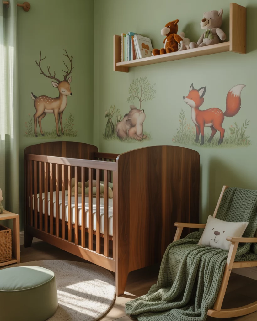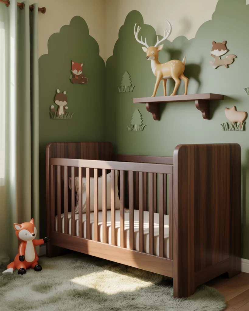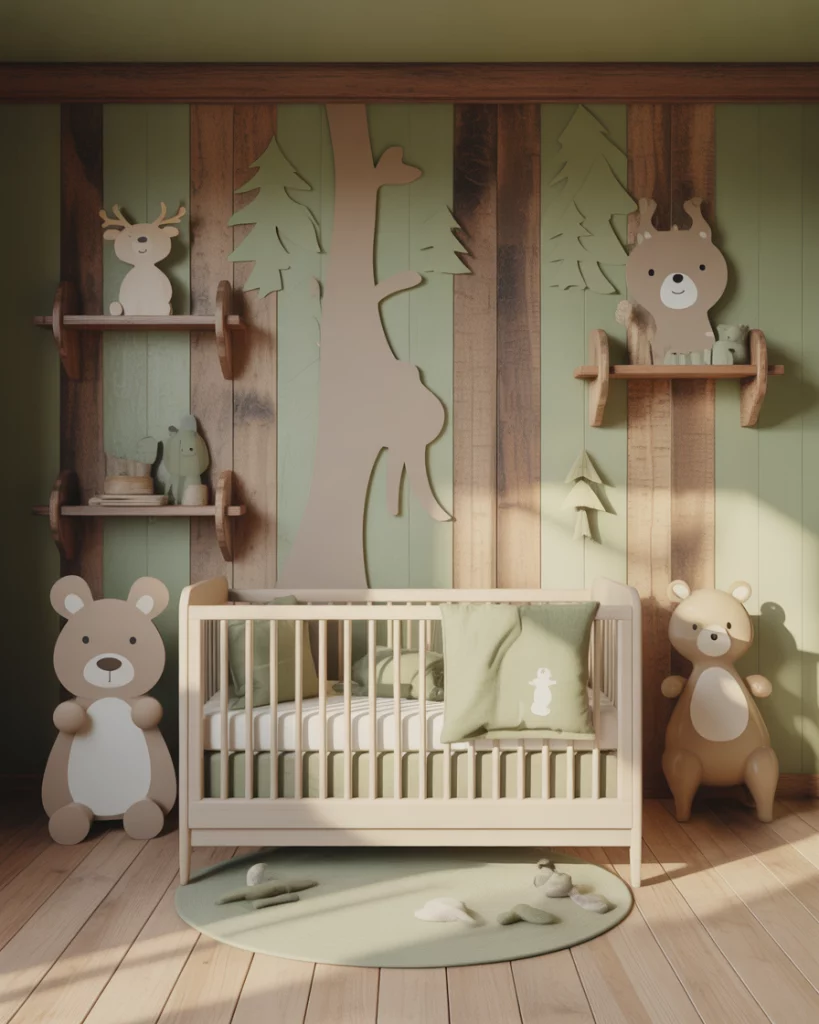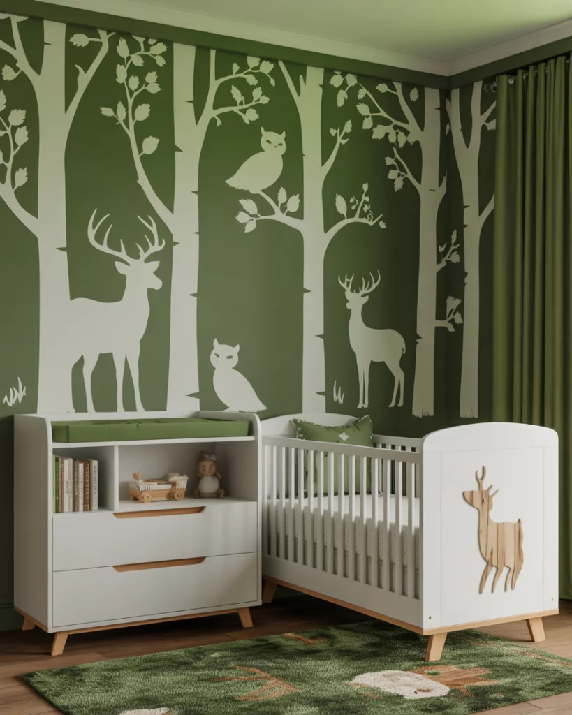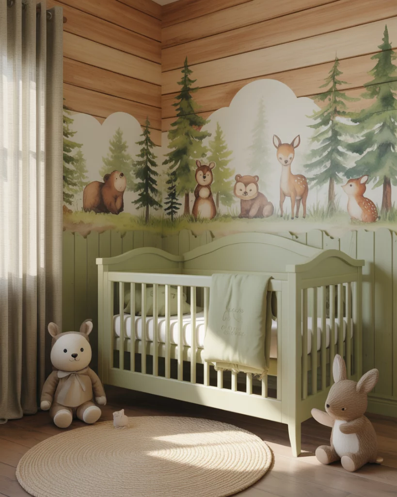 Imagine a cozy forest cabin nursery with rich textures and woodland charm. Use green tones with wood panel accents, cozy flannel curtains, and small plush deer and bears. A white crib softens the darker elements while maintaining a timeless balance. The design evokes campfire stories and crisp outdoor air—perfect for families who love weekend escapes into nature.