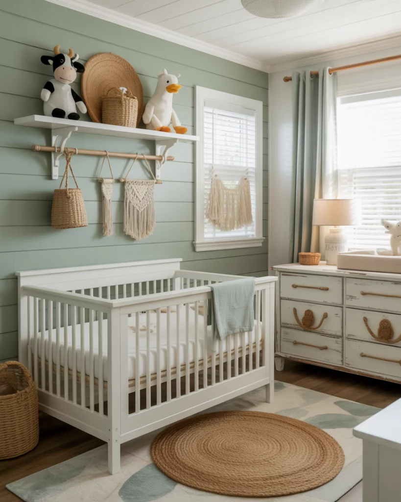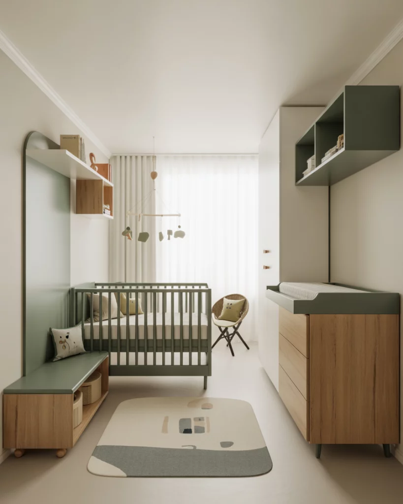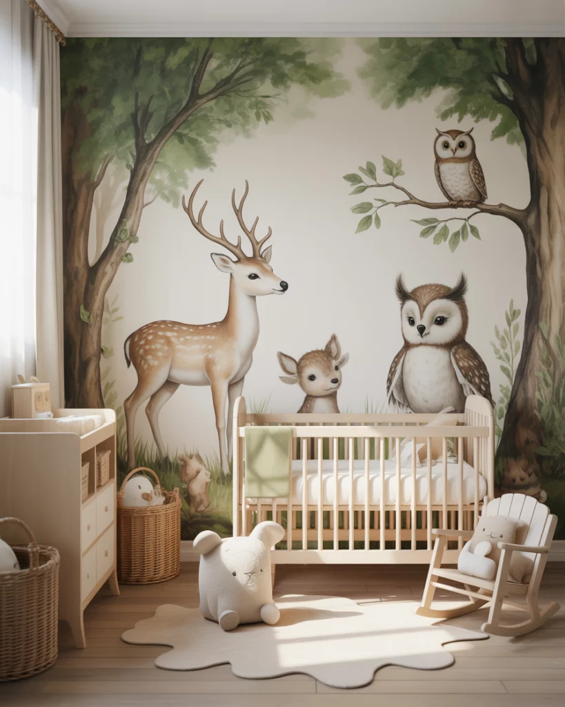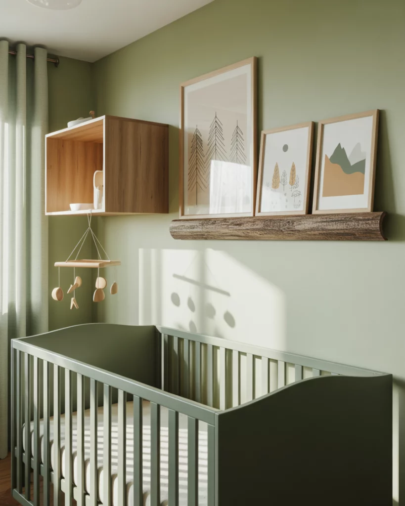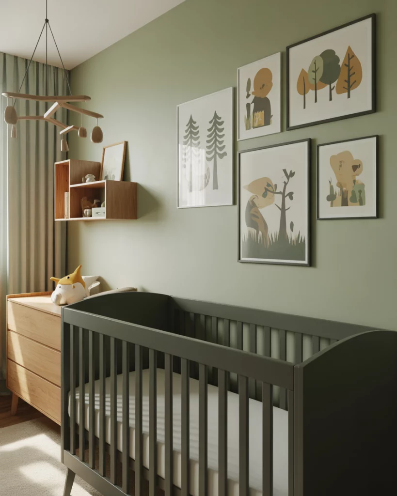 Imagine a cozy forest cabin nursery with rich textures and woodland charm. Use green tones with wood panel accents, cozy flannel curtains, and small plush deer and bears. A white crib softens the darker elements while maintaining a timeless balance. The design evokes campfire stories and crisp outdoor air—perfect for families who love weekend escapes into nature.