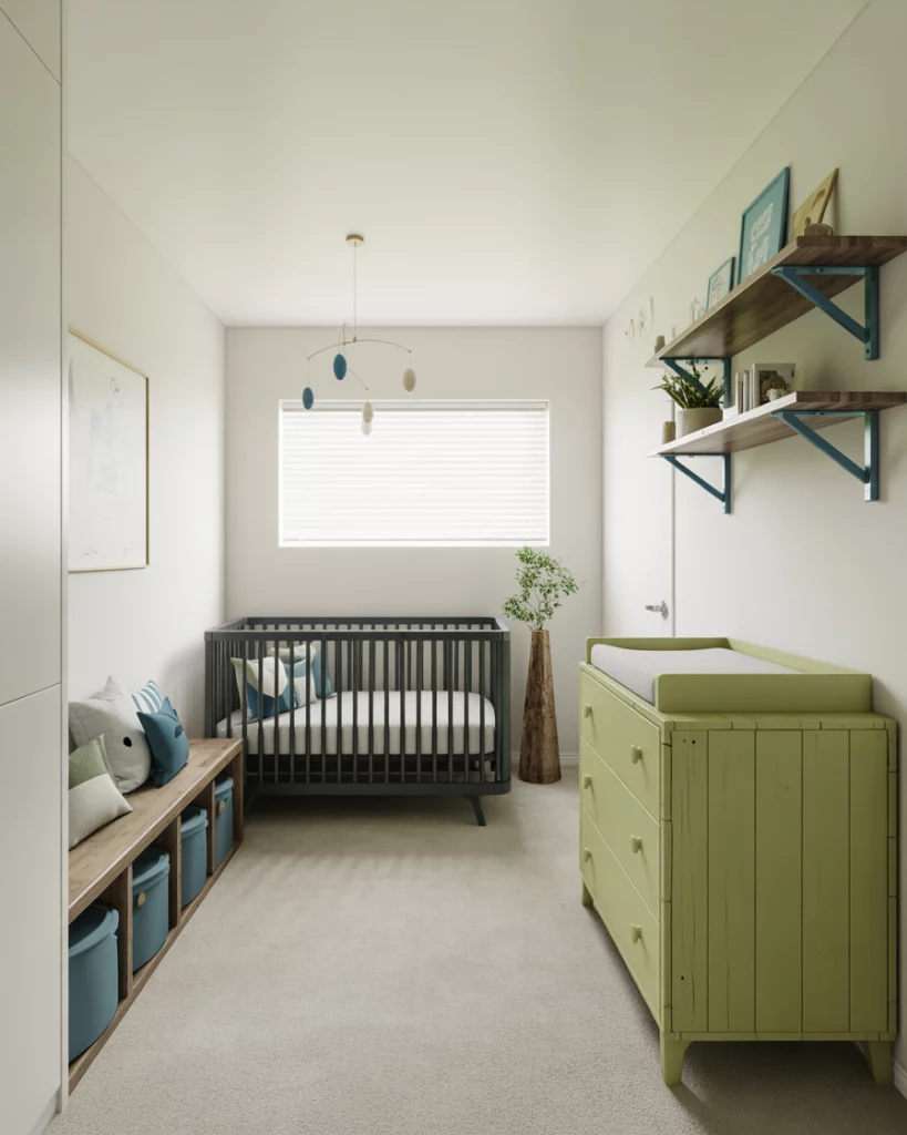 In 2026, many families face space constraints, making the minimalist and small room design both stylish and practical. Here you can choose an upcycled dresser, a sleek black crib, clean white walls, and pops of blue and green through cushions or décor. Keep toys and furniture to a minimum, favor multifunctional storage, and let one piece—perhaps a handmade mobile—be the hero. This style supports calm, clutter-free mornings and cleaner transitions as the baby grows.