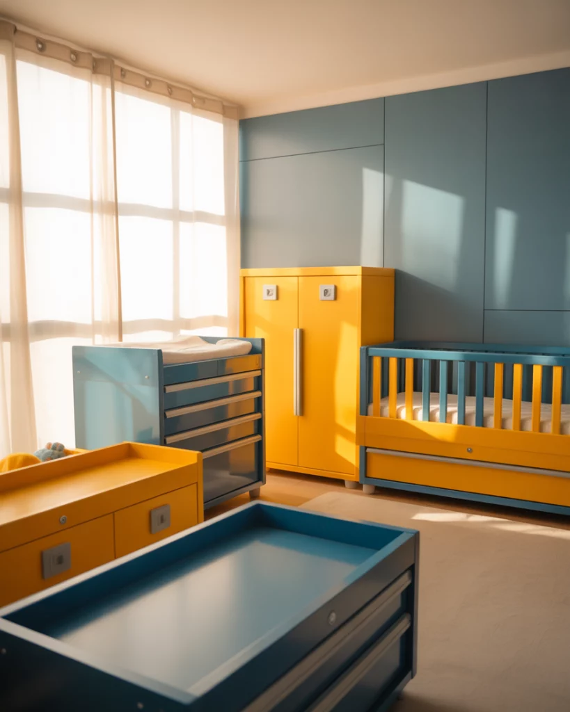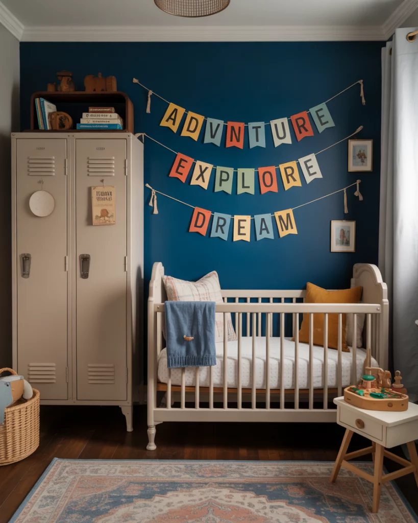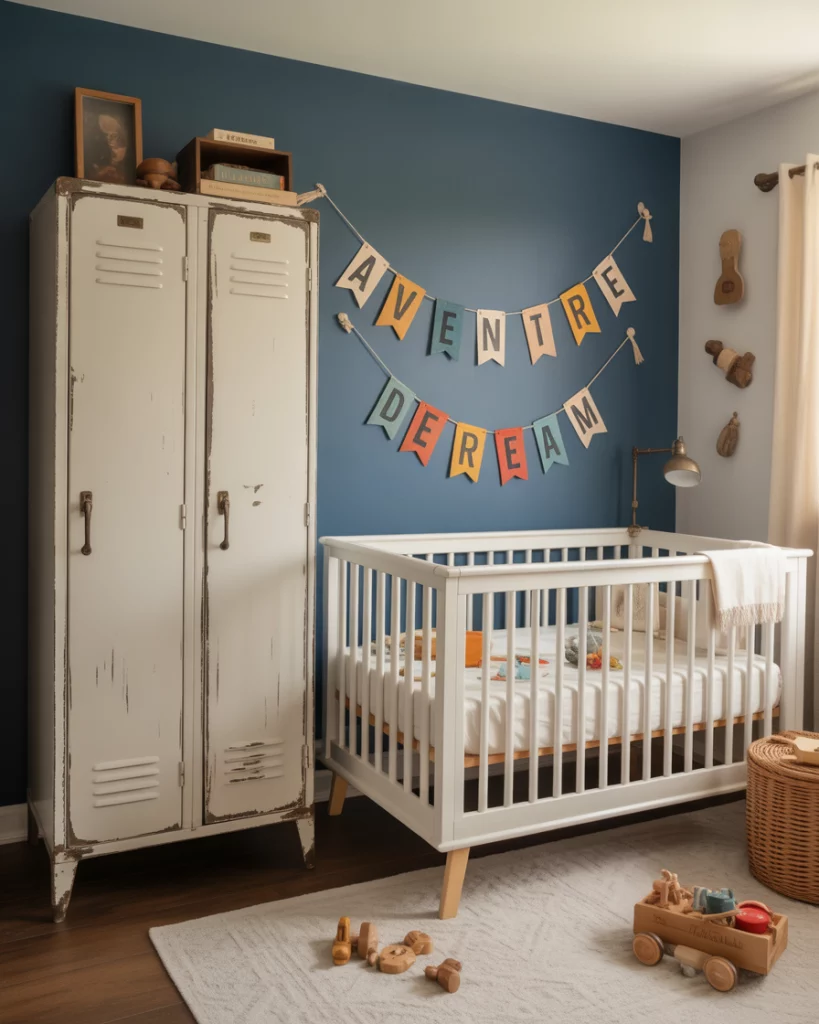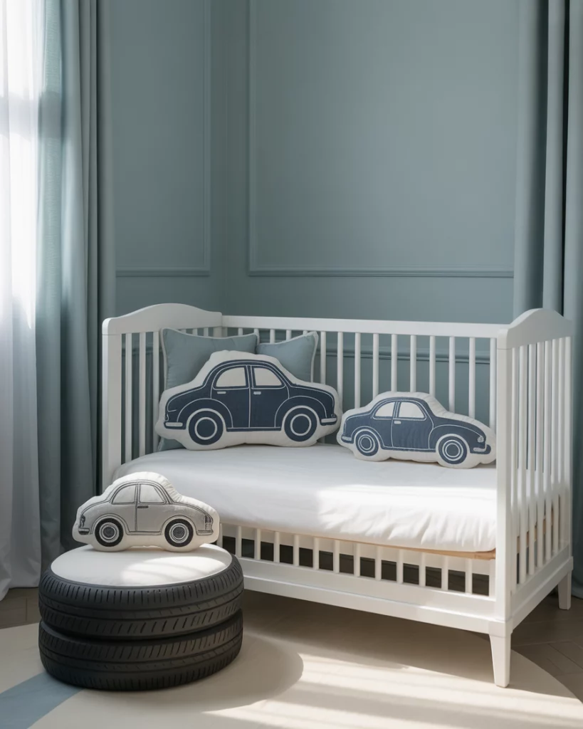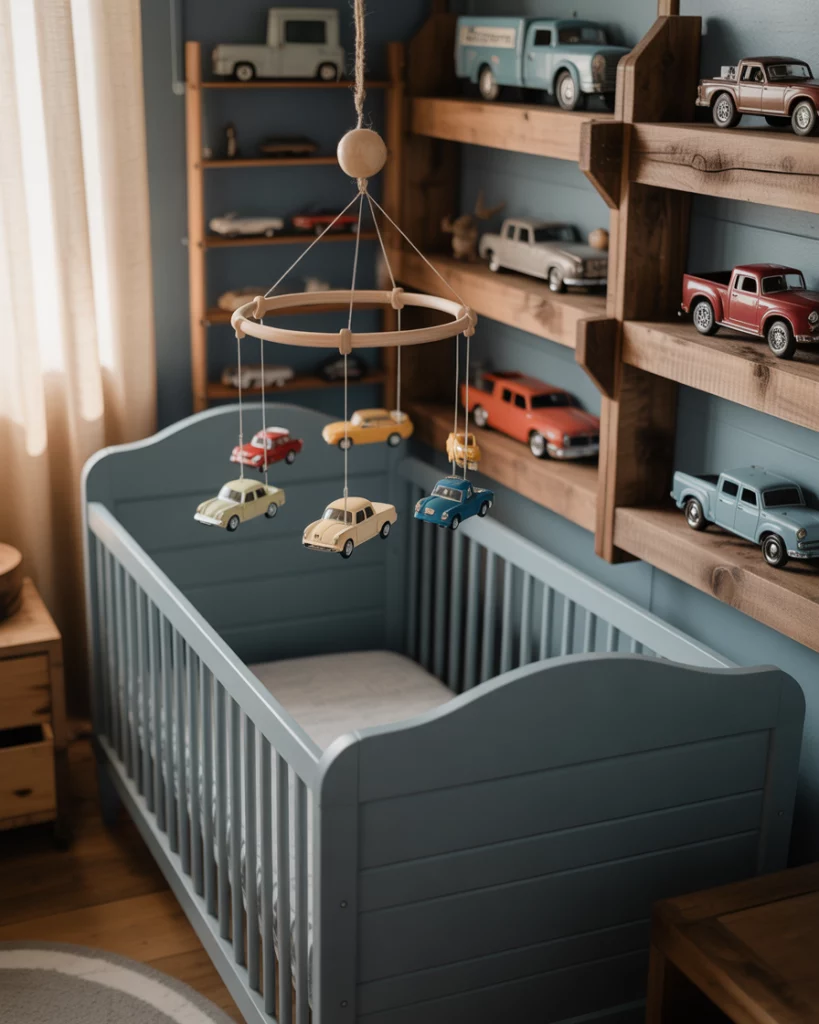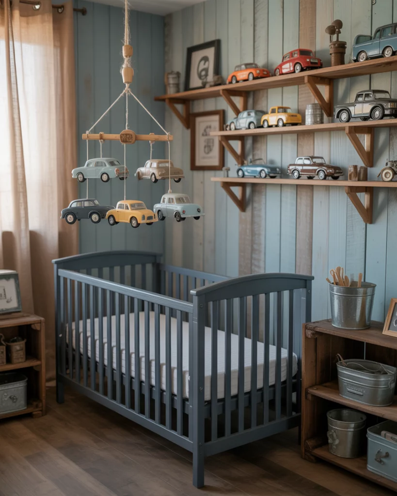 Perfect for design-savvy parents who love retro flair, this upcycled-car-garage nursery channels industrial cool. Use muted blue and neutral grays, hang old license plates or miniature car art, and add a handmade mobile crafted from toy cars. A sturdy black crib anchors the space, surrounded by rustic wooden shelves. It’s nostalgic, fun, and totally unique—just like your little driver-in-training.