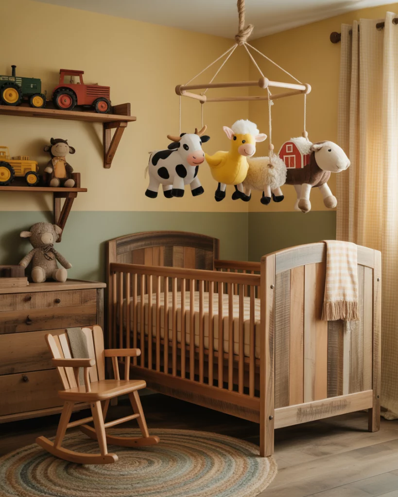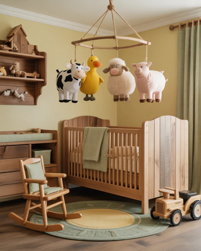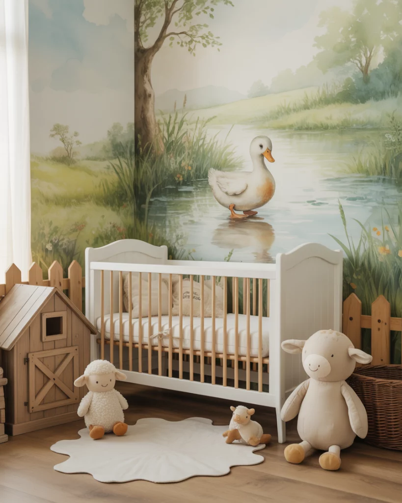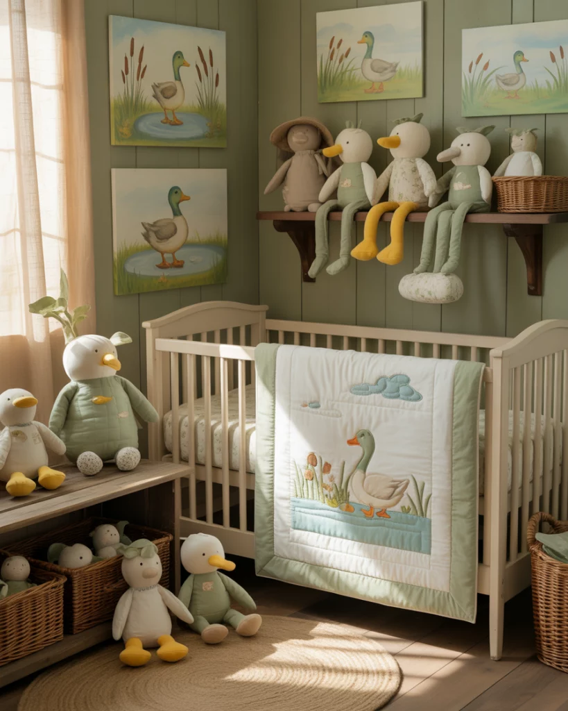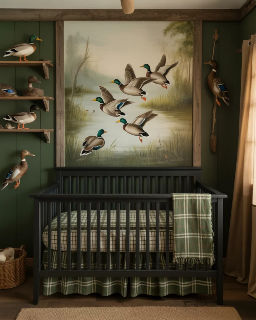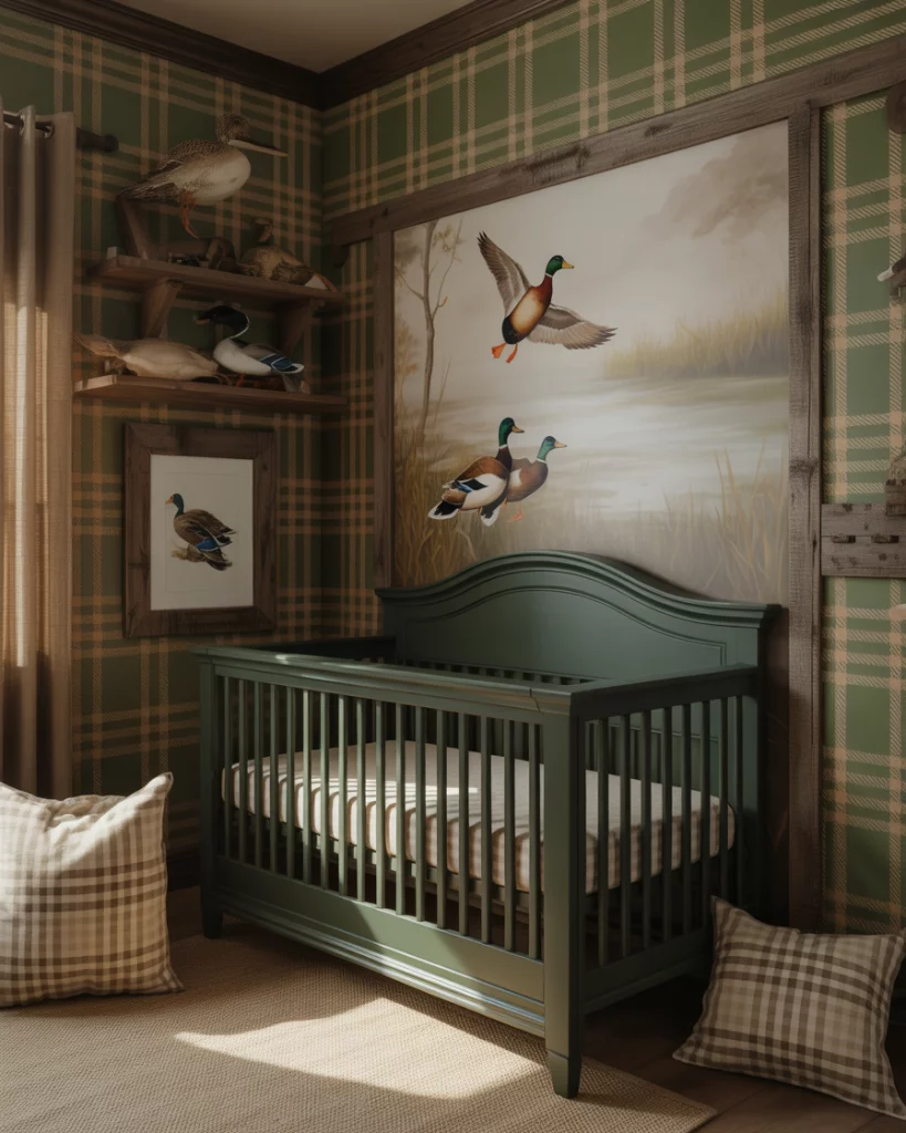 If you grew up near lakes or marshlands, a duck hunting-themed nursery can nod to family traditions with style. Choose deep green, khaki, and walnut tones, paired with rustic plaid textiles. A wall mural of ducks in flight or simple silhouette art adds movement without overwhelming the room. Combine a black crib and antique-style lamps for warmth and heritage.