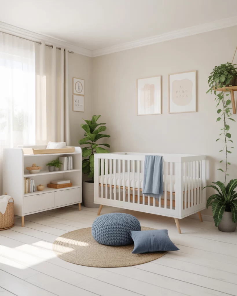 Scandinavian design thrives on simplicity—perfect for a minimalist, neutral, and simple nursery aesthetic. Think natural woods, white furniture, and a focus on function. Add a personalized wall art piece with the baby’s name in clean typography. Bring gentle color through green plants and blue textiles to prevent the space from feeling cold.