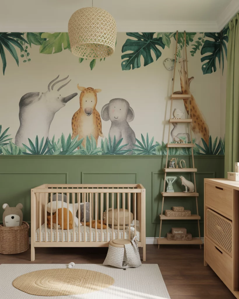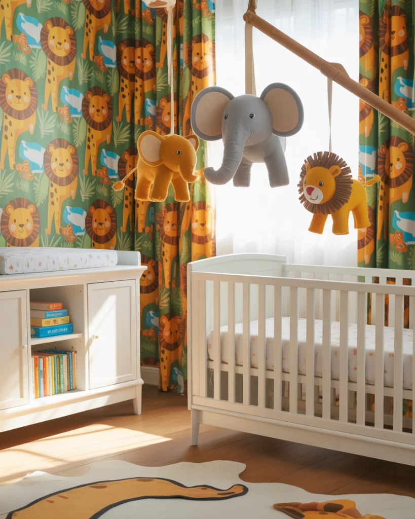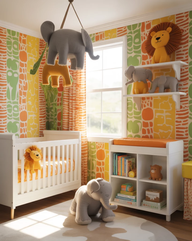 This theme celebrates energy and imagination. Combine bright animal prints with bold wall art for a colorful and playful safari atmosphere. Choose durable white furniture to ground the room while the art takes center stage. Add handmade felt elephants or lions for texture. It’s a joyful mix of creativity and comfort that grows with your child.